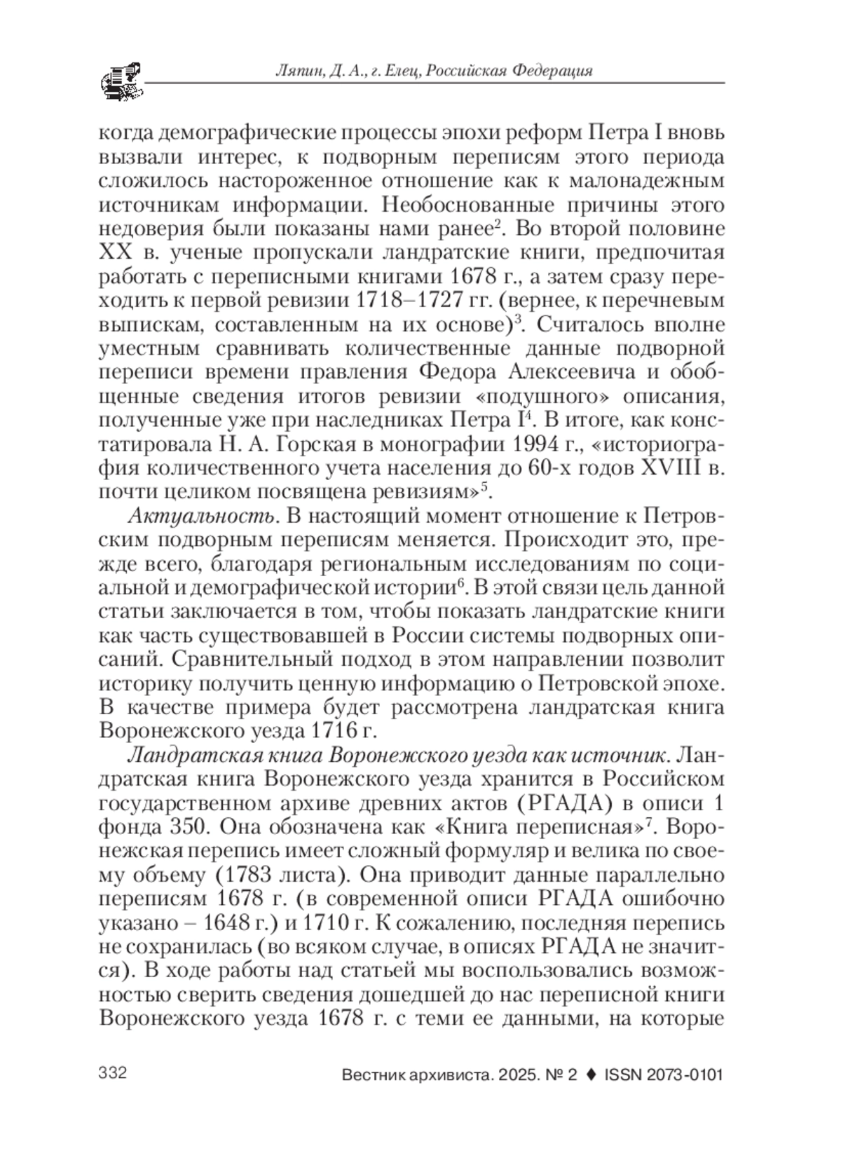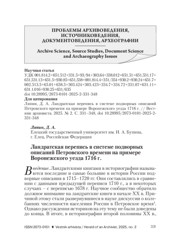 Введение. Ландратскими книгами в историографии называются последние и самые большие в истории России подворные описания в 1715–1720 гг. Они составлялись в сравнении с данными предыдущей переписи 1710 г., а в некоторых случаях – с переписью 1678 г. Научное сообщество обратило должное внимание на ландратские книги в начале XX в. Причиной этому стали развернувшиеся в науке дискуссии о колебаниях численности населения России в Петровское время