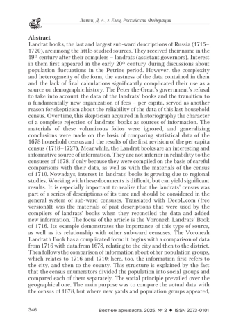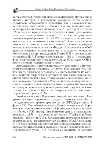 Ландратские книги, последние и самые крупные подворные описания России (1715-1720), относятся к числу малоизученных источников. Они получили свое название в XIX в. по имени их составителей - ландратов (помощников губернаторов). Интерес к ним впервые появился в начале XX в. во время дискуссий о колебаниях численности населения в Петровское время. Однако сложность и неоднородность формуляра, обширность содержащихся в них данных и отсутствие итоговых подсчетов существенно осложнили их использование как источника по демографической истории. Отказ Петровского правительства от учета сведений ландратских книг и переход к принципиально новой организации сборов - подушной, послужил еще одним основанием для скептического отношения к достоверности данных этой последней подворной переписи. Со временем этот скептицизм приобрел в историографии характер полного отказа от ландратских книг как источников информации. Материалы этих объемных фолиантов игнорировались, а обобщающие выводы делались на основе сравнения статистических данных подворной переписи 1678 г. и итогов первой ревизии подушной переписи (1718-1727). Между тем, ландратские книги - интересный и содержательный источник информации. Они не уступают в достоверности переписям 1678 г. хотя бы потому, что составлены на основе тщательных сопоставлений с их данными, а также с материалами переписи 1710 г. В настоящее время интерес к ландратским книгам возрастает благодаря региональным исследованиям. Работа с этими документами сложна, но может дать существенный результат. Особенно важно понять, что ландратская перепись была частью серии описаний своего времени и должна рассматриваться в общей системе подворных переписей. Именно на материалы прошлых описаний ориентировались составители ландратских книг, когда проводили сверку данных и добавление новой информации. В центре внимания статьи - воронежская ландратская книга 1716 г. На ее примере демонстрируется значение этого вида источника, а также его взаимосвязь с другими подворными переписями. Воронежская ландратская книга имеет сложный формуляр: она начинается со сравнения данных 1716 г. со сведениями 1678 г., касающимися города, а затем - уезда. Затем следует сопоставление информации о других группах населения, относящееся уже к 1716 и 1710 гг.: здесь также вначале информация относится к городу, а потом - к уезду. Такая структура объясняется тем, что переписчики разделяли население на социальные группы и сравнивали каждую из них отдельно. Социальный принцип превалировал над географическим. Главной целью было сравнение актуальных данных с переписью 1678 г., но там, где появились новые дворы и группы населения, сопоставление которых со старой переписью было невозможным, они обращались к материалам описания 1710 г. После определения структуры книги можно сравнить ее сведения с переписной книгой 1678 г. и особой воронежской переписью 1714 г. Проведенный анализ в итоге показывает, что данные, полученные ландратами, более полны, чем все другие. Итак, изученные материалы наглядно демонстрируют важность сравнительных исследований в изучении комплекса ландратских книг. Именно таким способом можно оценить полноту данных каждой книги в отдельности, увидеть ее место в общем ряду подворных переписей региона. Только такая тщательная и кропотливая работа может да