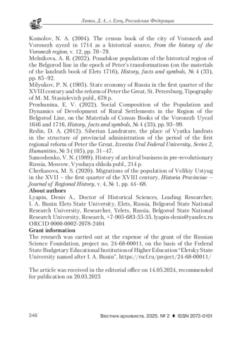 14. Прошунина, Е. В. Социальный состав населения и динамика развития сельских поселений региона Белгородской черты (по материалам переписных книг Воронежского уезда 1646 и 1716 гг.) // История: факты и символы. 2022. № 4 (33). С. 93-99. EDN: YQBQCH