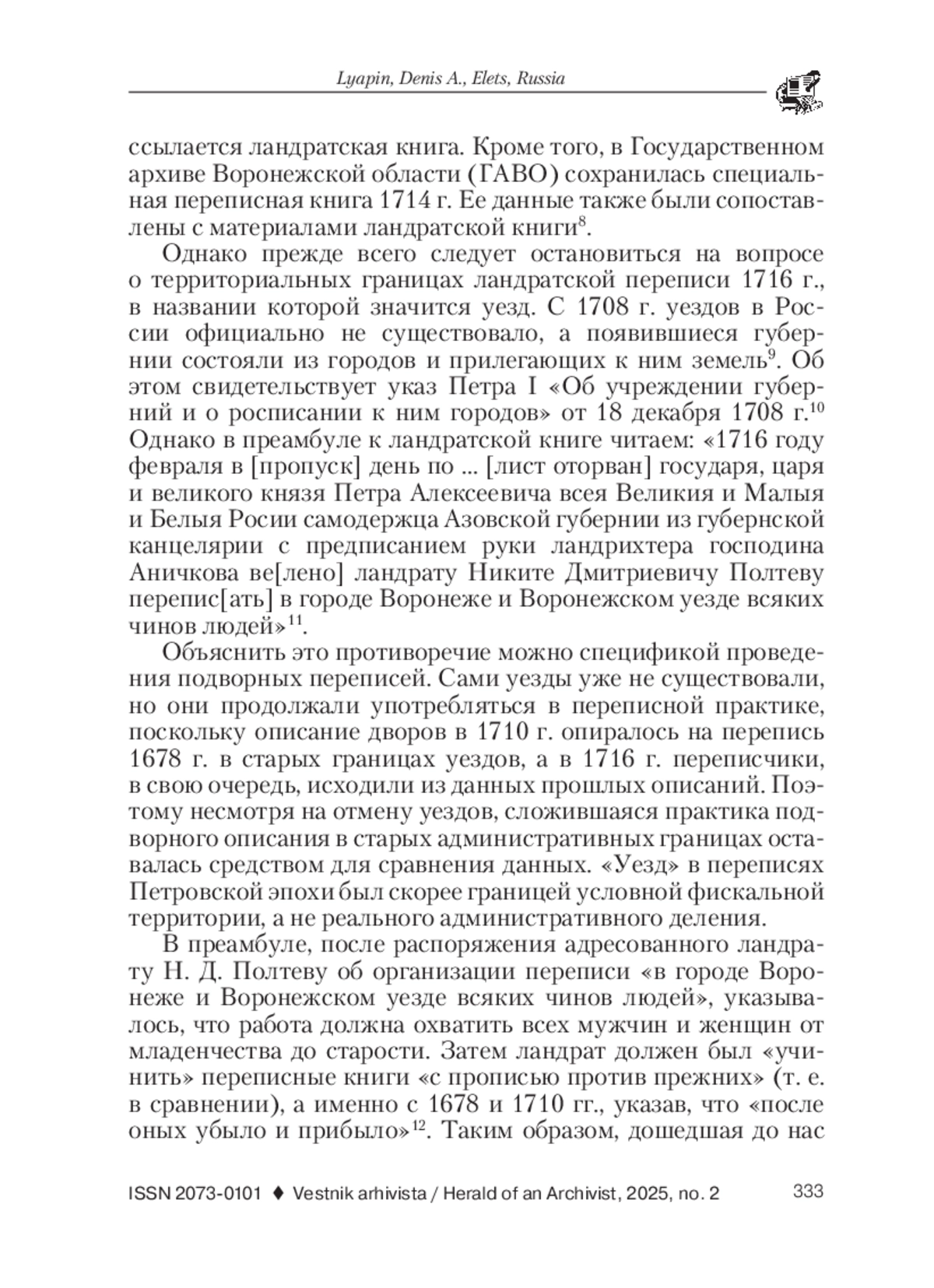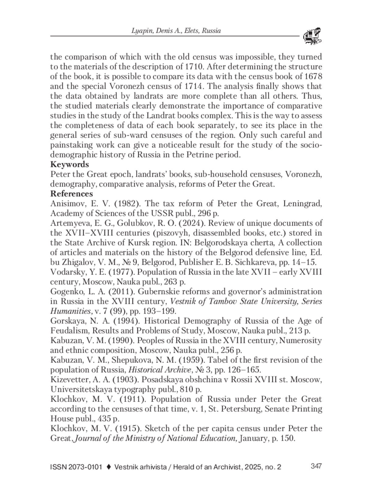 12. Мельникова, А. Р. Посадское население исторического региона Белгородской черты в эпоху Петровских преобразований (по материалам ландратской книги Ельца 1716 г.) // История: факты и символы. 2022. № 4 (33). С. 85-92. EDN: QIFASE