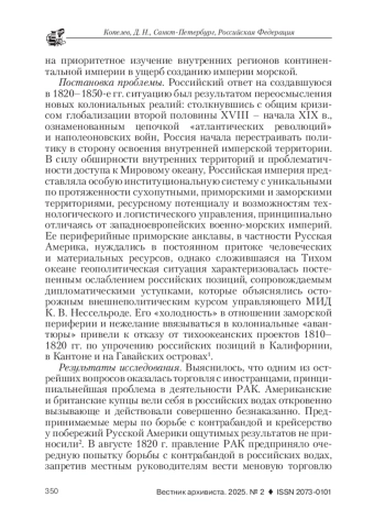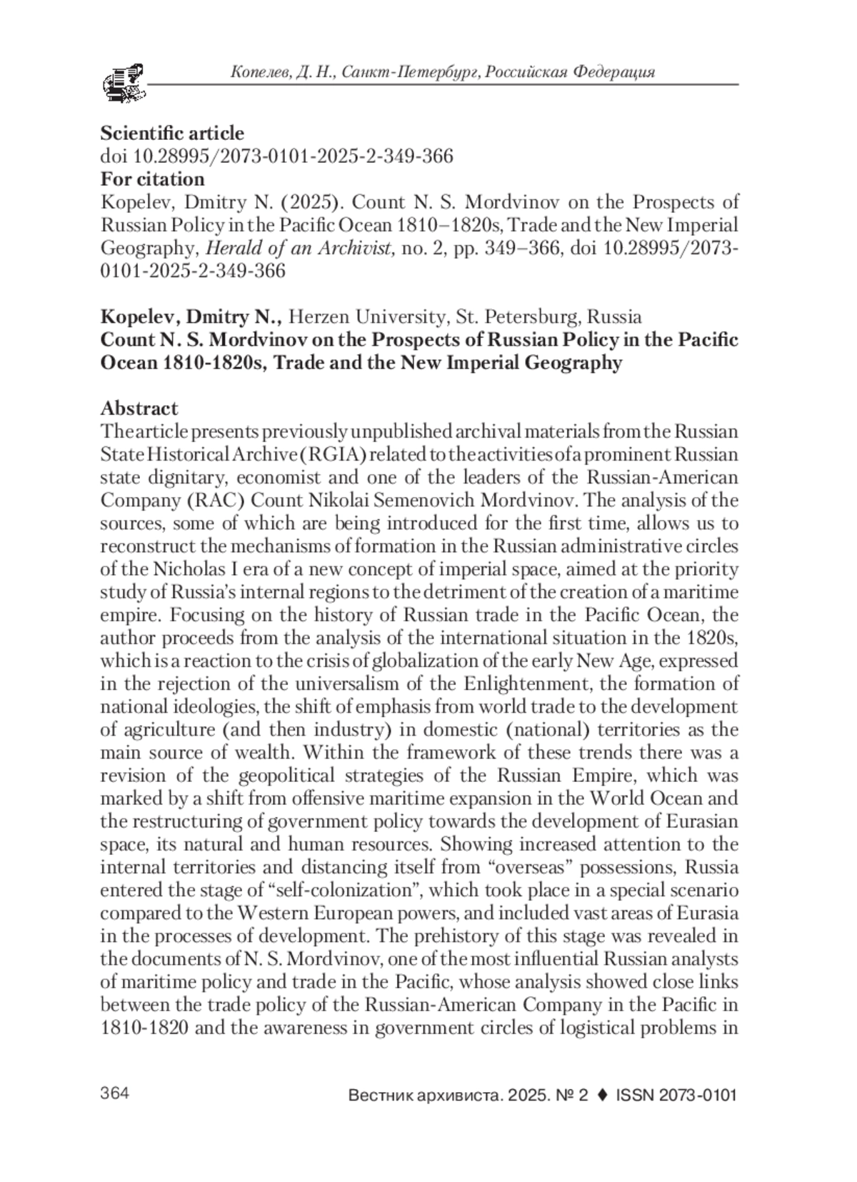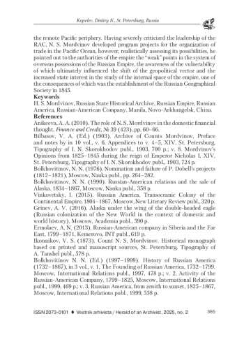 В статье представлены не опубликованные ранее архивные материалы из Российского государственного исторического архива (РГИА), связанные с деятельностью видного российского государственного сановника, экономиста и одного из руководителей Российско-американской компании (РАК) графа Николая Семеновича Мордвинова. Анализ источников, часть которых впервые вводится в научный оборот, позволяет реконструировать механизмы формирования в российских управленческих кругах эпохи Николая I новой концепции имперского пространства, направленной на приоритетное изучение внутренних регионов России в ущерб созданию морской империи. Фокусируя внимание на истории русской торговли на Тихом океане, автор исходит из анализа международной ситуации 1820-х гг., представляющей реакцию на кризис глобализации раннего Нового времени, выразившийся в отказе от универсализма Просвещения, становлении национальных идеологий, смещении акцентов с мировой торговли на развитие сельского хозяйства (а затем и промышленности) на внутренних (национальных) территориях как главному источнику богатства. В рамках этих тенденций происходил пересмотр геополитических стратегий Российской империи, ознаменовавшийся отходом от проведения наступательной морской экспансии в Мировом океане и перестройкой правительственной политики в сторону освоения евразийского пространства, его природных и человеческих ресурсов. Проявляя повышенное внимание к внутренним территориям и дистанцируясь от «заморских» владений, Россия вступила в этап «самоколонизации», проходивший по-особому, в сравнении с западноевропейскими державами, сценарию и включавший в процессы освоения обширные пространства Евразии. Предыстория этого этапа обнаружилась в документах Н. С. Мордвинова, одного из влиятельнейших российских аналитиков в вопросах морской политики и торговли на Тихом океане, анализ которых продемонстрировал тесные связи между торговой политикой Российско-американской компании на Тихом океане в 1810-1820 гг. и осознанием в правительственных кругах логистических проблем на отдаленной тихоокеанской периферии. Подвергая острой критике руководство РАК, Н. С. Мордвинов разрабатывал программные проекты организации торговли на Тихом океане, однако реалистично оценивая ее возможности, указывал властям на «слабые» точки в системе заморских владений Российской империи, осознание уязвимости которых повлияло в конечном счете на смещение геополитического вектора и возросший государственный интерес к изучению внутреннего пространства империи, одним из последствий которого стало создание в 1845 г. Русского географического общества.