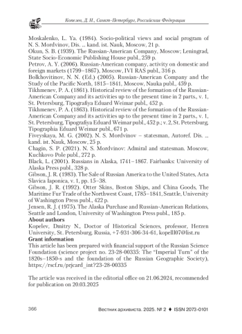 7. Ермолаев, А. Н. Российско-американская компания в Сибири и на Дальнем Востоке, 1799-1871 гг. Кемерово: ИНТ, 2013. 619 c. EDN: RLDLMP