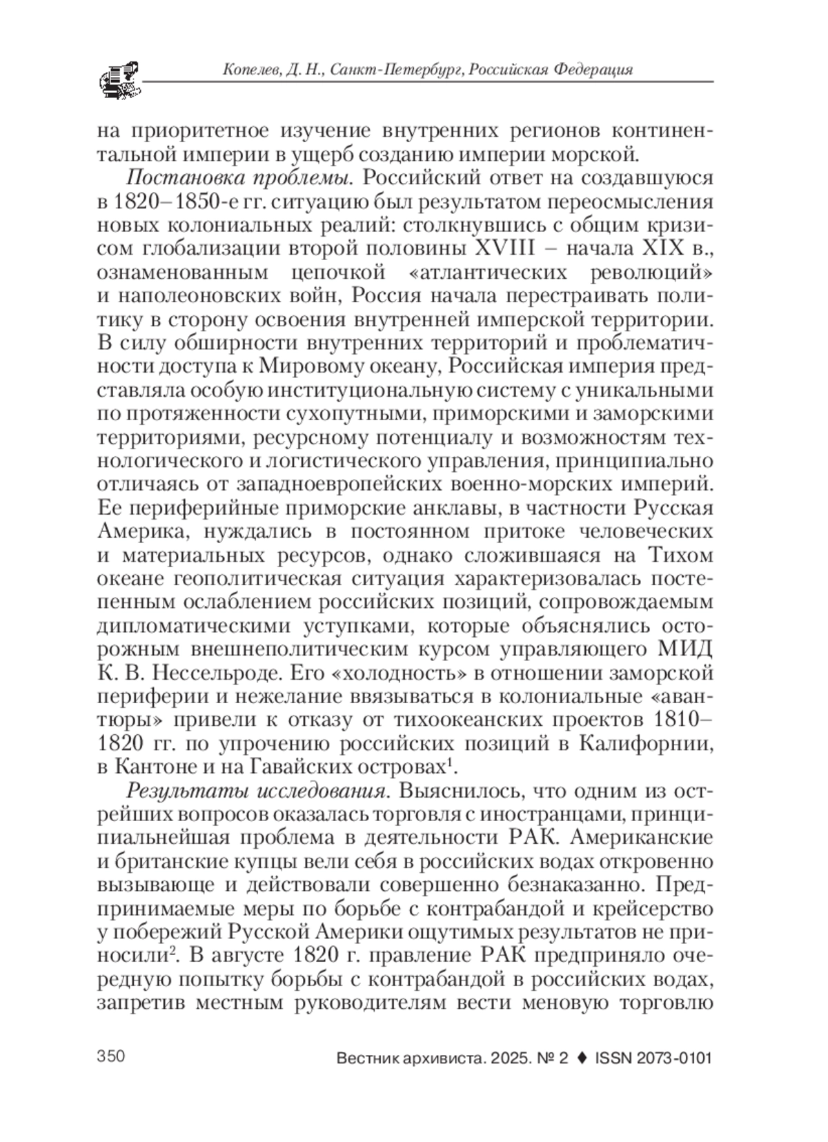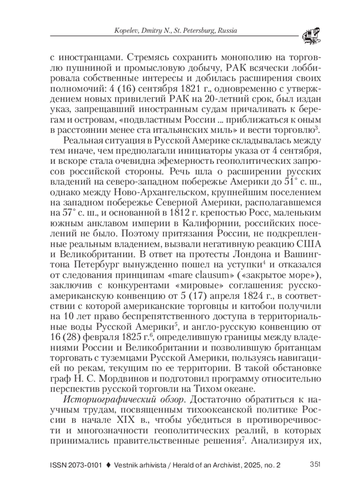Введение. В архивных делах видного сановника эпохи Александра I, председателя Вольного экономического общества и члена правления Российско-американской компании (РАК) адмирала и графа Н. С. Мордвинова в Российском государственном историческом архиве (РГИА) сохранились документы, позволяющие реконструировать взгляды российской элиты на систему и методы управления имперскими морскими анклавами и исследовать мотивы, под влиянием которых принимались важнейшие решения колониальной политики и, в частности, один из наиболее спорных, касающийся продажи Русской Америки