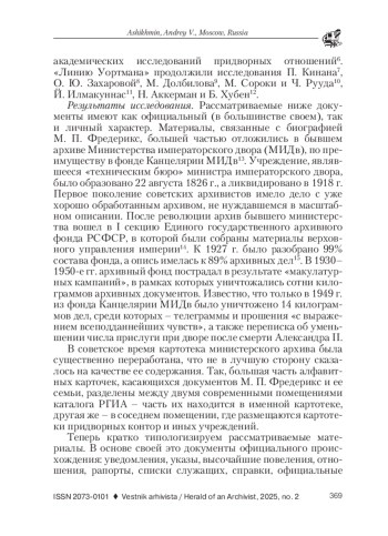 В статье представлен краткий обзор документальных материалов бывшего архива Министерства императорского двора (МИДв), связанных с биографией и придворной службой баронессы Марии Петровны Фредерикс (1832-1903). Автор ставит задачу ввести в научный оборот и систематизировать придворно-бюрократические документы, связанные с деятельностью фрейлины. Рассмотрены и систематизированы материалы Канцелярии МИДв о вступлении ее в звание фрейлины (1849-1850) и увольнении из штата (1868), о похоронах и завещании (1903), о крымском имении Джемиет и некоторые другие. Подчеркивается слабая изученность архивных материалов, связанных с М. П. Фредерикс, несмотря на известность и востребованность в историографии ее воспоминаний. Обзор архивных материалов включает введение в научный оборот документов из фондов Канцелярии МИДв и Главного управления уделов, находящихся на хранении в Российском государственном историческом архиве (РГИА). В контексте изучения биографии баронессы М. П. Фредерикс анализируется отечественная и зарубежная историография последних десятилетий, а также приводится краткая история рассматриваемых архивных комплексов. Автором представлена типология официальных и личных документов, связанных с М. П. Фредерикс: в основном это уведомления, указы, высочайшие повеления, отношения, рапорты, списки служащих, справки, официальные телеграммы, личные письма, а также завещание баронессы. Документы бывшего архива МИДв содержат сведения как о петербургском периоде службы фрейлины, так и о ее жизни в Крыму после увольнения в 1868 г. Впервые в полном виде публикуется прощальное письмо баронессы императору Николаю II (2 апреля 1903 г.), обнаруженное в деле «О смерти фрейлины баронессы М. П. Фредерикс» из фонда Канцелярии МИДв. Также вводятся в оборот некоторые материалы о похоронах, завещании и судьбе имущества фрейлины. Методологическая основа статьи - традиционный историко-архивоведческий подход, применяющийся к малоизученным источникам. Использованы классические для архивного обзора генетический и общенаучный методы, а также метод исторической периодизации. Автор показал, что выявление официальных источников и рассмотрение их в контексте истории такого значимого института, как императорский двор - первые шаги на пути к созданию полноценной картины культурной и бюрократической истории русского двора периода империи. Фигура баронессы М. П. Фредерикс в этом смысле более чем репрезентативна: исследователи знают о ней в большей степени по ее собственным рассказам, нежели по фиксирующим придворную реальность архивам имперской бюрократии.