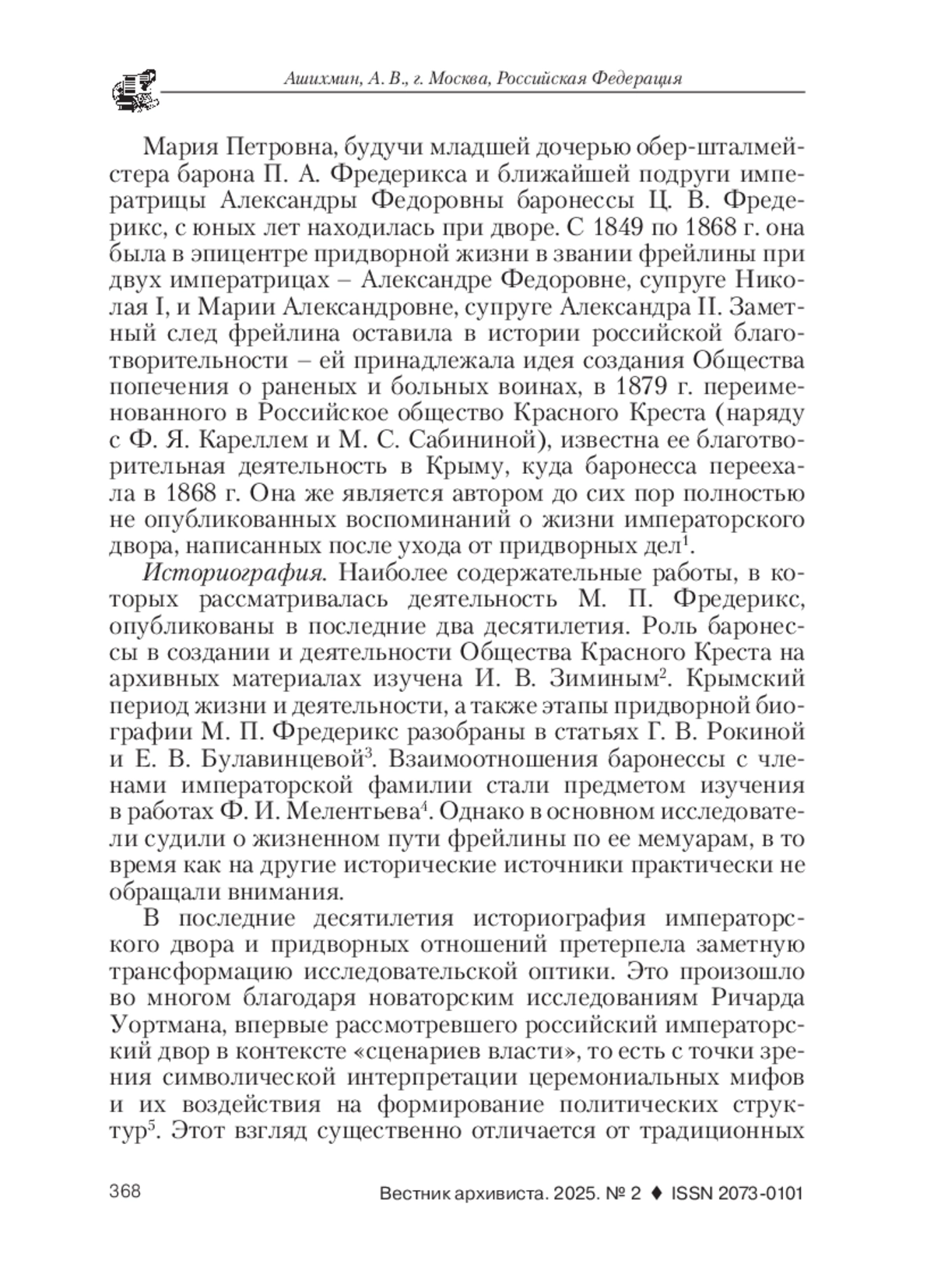 4. Зимин, И. В. Мария Петровна Фредерикс // Вопросы истории. 2011. № 7. С. 140-148.