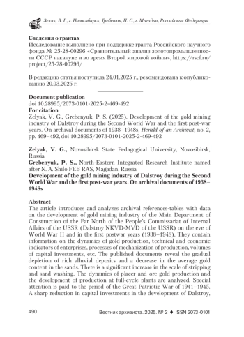 В статье вводятся в научный оборот и анализируются архивные справки-таблицы с данными о развитии золотодобывающей промышленности Главного управления строительства Дальнего Севера Наркомата внутренних дел СССР (Дальстрой НКВД-МВД СССР)в преддверии Второй мировой войны и в первые послевоенные годы (1938-1948). Они содержат информацию о динамике добычи золота, технико-экономических показателях предприятий, процессах механизации производства, объемах капитальных вложений и др. Публикуемые документы раскрывают постепенное истощение богатых россыпных месторождений, снижение среднего содержания золота в песках. Отмечается значительный рост масштабов вскрышных работ и объемов промывки песков. Проанализирована динамика добычи шлихового и рудного золота, развитие производства на фабриках полного цикла. Особое внимание уделено периоду Великой Отечественной войны 1941-1945 гг. Наблюдается резкое сокращение капитальных вложений в развитие Дальстроя, объемов грузоперевозок и поставок важнейших видов оборудования. Отмечена способность отрасли функционировать и обеспечивать производство стратегического металла в сложных условиях военного времени. Исследованы высокие темпы механизации производства в послевоенный период, технического перевооружения Дальстроя, увеличения парка техники. Фиксируется рост производительности труда на всех этапах горных работ. Выявлены проблемы с поставками оборудования для нужд отрасли в послевоенные годы. Подчеркнута способность Дальстроя расширять масштабы добычи благодаря росту капитальных вложений, внедрению новых технологий. Публикуемые документы содержат уникальную статистическую информацию о технико-экономических параметрах золотодобычи Дальстроя в 1938-1948 гг. и позволяют комплексно оценить тенденции развития золотодобывающей отрасли в сложных экономических условиях военного времени.