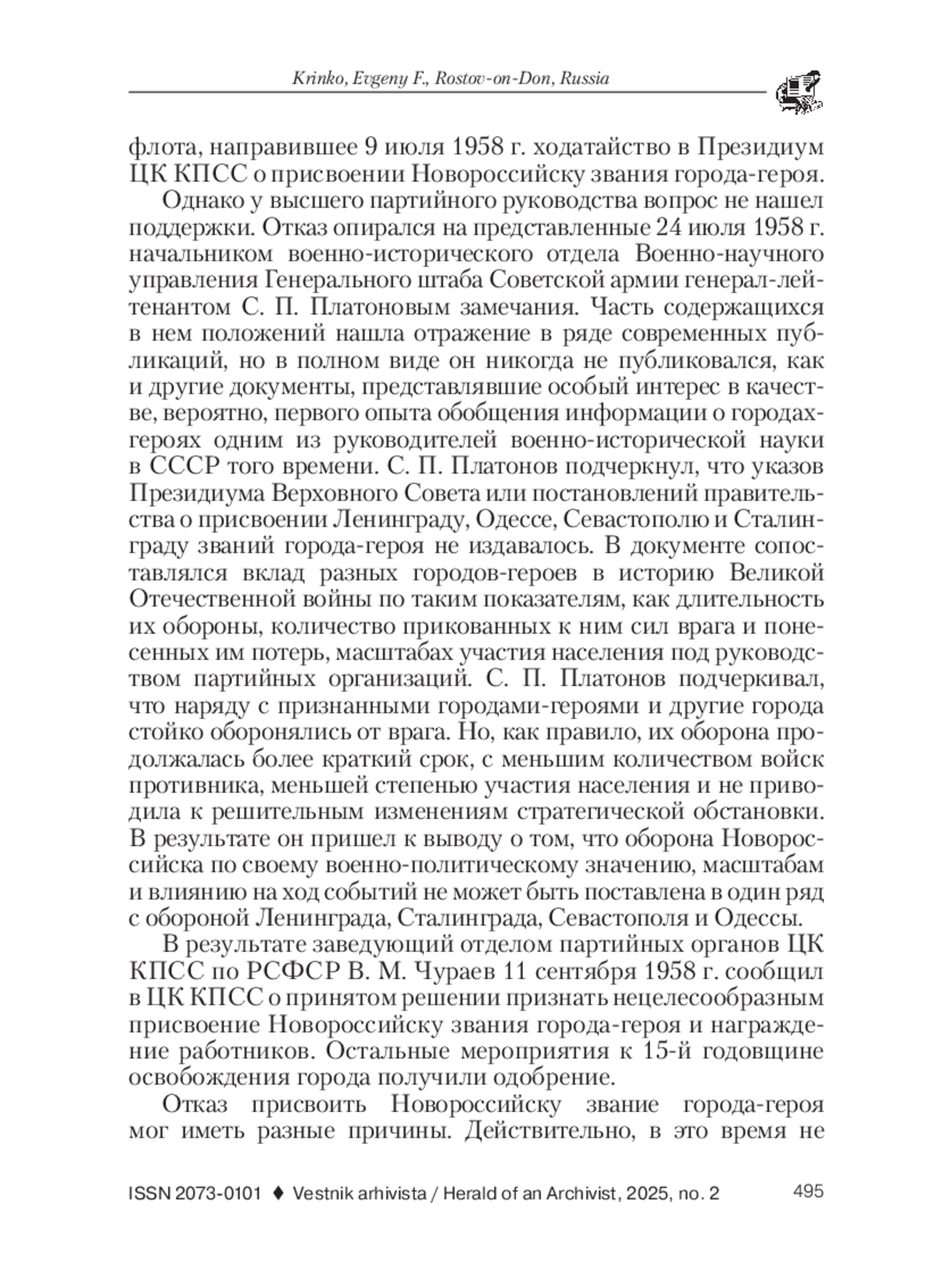 В статье отмечается, что города-герои играли значимую роль в увековечивании памяти в СССР о событиях Великой Отечественной войны. Однако обстоятельствам самого присуждения почетного звания в историографии уделяется недостаточно внимания, в том числе, в связи с отсутствием в распоряжении исследователей необходимых источников. Цель публикации - ввести в научный оборот документы о попытке присвоения Новороссийску почетного звания города-героя в 1958 г. С инициативой об этом выступили Новороссийский горком КПСС и горисполком. Мемориальную инициативу поддержали Краснодарский крайком КПСС и крайисполком, а также командование Черноморского флота. Однако партийное руководство отказалось принять решение. Соответствующее обоснование подготовил военно-исторический отдел Военно-научного управления Генерального штаба Советской армии. В нем рассматривалось появление данного почетного звания, сравнивался вклад разных городов-героев в историю Великой Отечественной войны по длительности их обороны, количеству прикованных сил врага и понесенных им потерь, масштабам участия населения под руководством партийных организаций. В результате делался вывод о том, что оборона Новороссийска не может быть поставлена рядом с обороной Ленинграда, Сталинграда, Севастополя и Одессы, ранее признанных городами-героями. В публикации представлены четыре взаимосвязанных документа: выписка из протокола заседания бюро Краснодарского краевого комитета КПСС и крайисполкома, направленная в ЦК КПСС, в которой содержатся предложение разрешить Новороссийскому горкому КПСС и горисполкому провести празднование 15-й годовщины освобождения города от оккупантов, просьбы присвоить Новороссийску звание города-героя и наградить 150-200 активных участников его обороны, освобождения и восстановления; ходатайство командования Черноморского флота в Президиум ЦК КПСС о присвоении Новороссийску звания города-героя; замечания начальника военно-исторического отдела Военно-научного управления Генерального штаба Советской армии генерал-лейтенанта С. П. Платонова; информация о принятом решении заведующего отделом партийных органов ЦК КПСС по РСФСР В. М. Чураева. Информативная ценность документов оценивается с учетом принципа историзма, с использованием проблемно-хронологического, ретроспективного и диахронного методов, а также источниковедческого анализа, что позволило проследить динамику в разработке и реализации мемориальной инициативы в контексте событий периода «оттепели». Публикация позволяет ответить и на более общие вопросы отношения советского руководства к почетному званию города-героя, раскрыть его символическое значение.