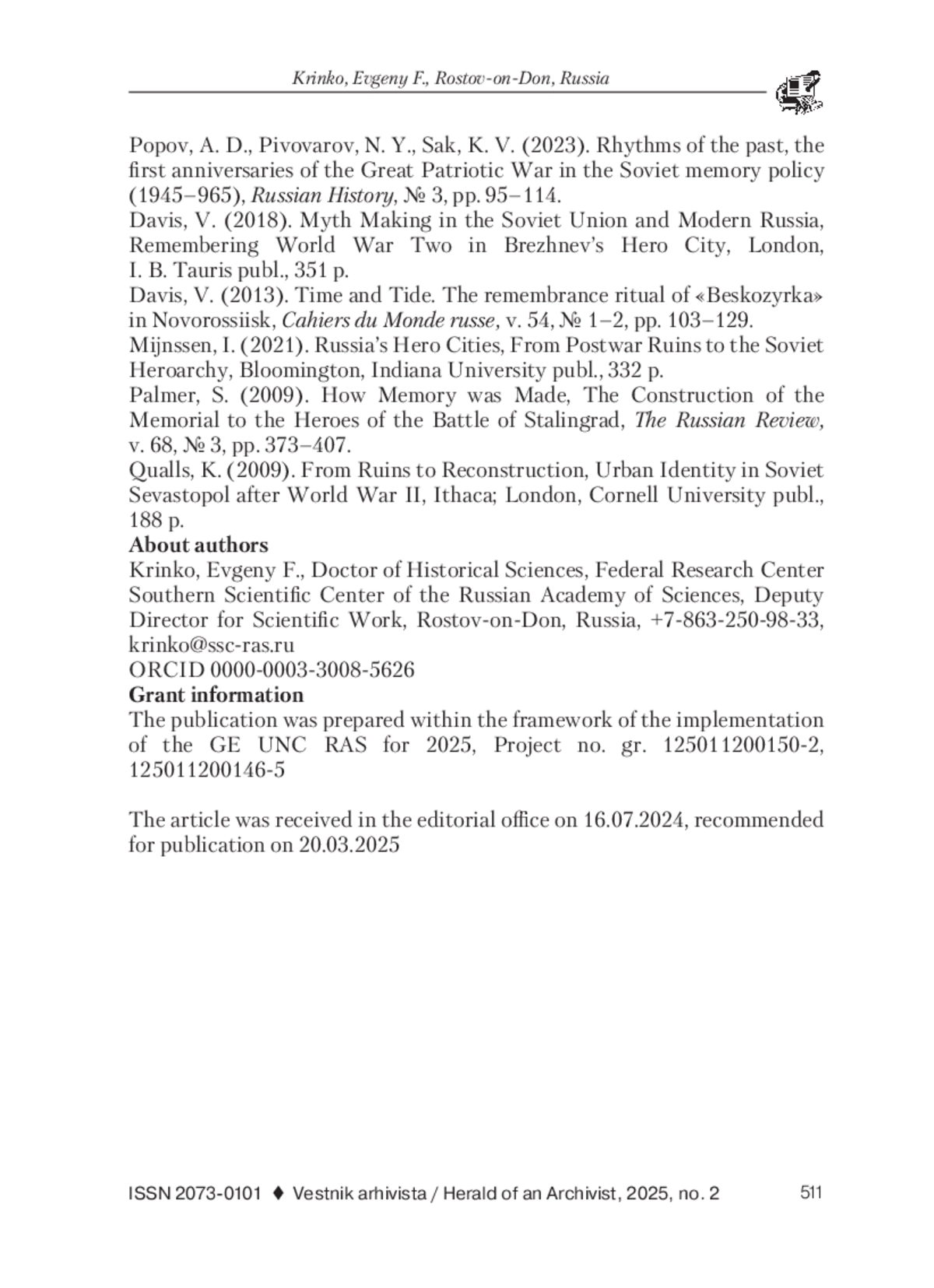 7. Попов, А. Д., Пивоваров, Н. Ю., Сак, К. В. Ритмы прошлого: первые годовщины Великой Отечественной войны в советской политике памяти (1945-1965) // Российская история. 2023. № 3. С. 95-114. EDN: ERBAKT