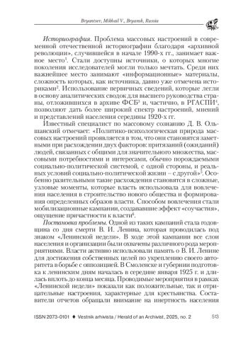 Введение. Настроение масс – довольно сложный и важный компонент общественного сознания, обладающий определенной долей изменчивости и пластичности, способный колебаться от поддержки до отторжения мероприятий власти. Все это нашло отражение в отчетах участников, ответственных за проведение «Ленинской недели» в первую годовщину смерти В. И. Ленина, хранящихся в Государственном архиве новейшей истории Смоленской области. Знакомство с материалами с мест позволяло партийной власти не только контролировать настроения населения, но и принимать превентивные меры для предотвращения возможных негативных последствий, формируя соответствующий тип поведения