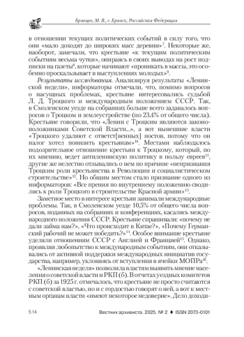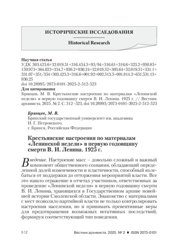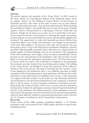 В статье анализируются материалы «Ленинской недели» 1925 г., хранящиеся в Государственном архиве новейшей истории Смоленской области. В основном это «отчеты» о проведении «Ленинской недели» на территории Смоленской губернии. Ценность такого рода источника заключается в их первичности и незначительной обработанности - это материалы из первых рук. Изучая материалы «отчетов», следует учитывать свойство общественного мнения, для которого характерно расхождение вербального и реального поведения. Люди не всегда поступают так, как говорят. Отмечается, что в постсоветский период значительно возрос интерес исследователей к изучению настроений, представлений и восприятию событий как внутри страны, так и заграницей. Возможность работать с материалами, ранее скрытыми от исследователей, позволяет уточнять, а порой и менять наши представления о прошлом. Это касается человека раннесоветского периода, который часто воспринимался, как «винтик» огромного советского механизма. Знакомство с материалами, отражающими общественные настроения, показывает на большое количество людей, способных критически мыслить, не поддающихся на пропагандистские уловки власти, которая, используя самые разные поводы, методично оказывала давление на сознание населения. Одним из таких поводов стала смерть В. И. Ленина и последующие за этим траурные мероприятия. Первая годовщина смерти В. И. Ленина была использована властью для трансляции населению необходимых не только внутри-, но внешнеполитических образов. Проведение «Ленинской недели» было призвано сформировать опыт коллективной идентичности советского человека. Автор приходит к выводу о том, что «отчеты» о проведении намеченных властями мероприятий показывают самый разный спектр общественных настроений смоленского крестьянства: от согласия с позицией властей о достижениях в строительстве нового общества до выражения негативного отношения к ней. В последнем случае информаторы приписывали такие настроения антисоветски настроенному кулачеству и, вообще, чуждым советской власти элементам. Исследование крестьянских настроений Смоленской губернии показали, что результаты «Ленинской недели» оказались не совсем те, на которые рассчитывала власть. Несмотря на заверения информаторов о росте политической активности крестьянства, все же чаще всего отмечалась политическая пассивность населения. Крестьян в большей мере интересовали самые насущные проблемы, связанные с их повседневной жизнью: касалось ли это международных событий или судьбы Л. Д. Троцкого - все «вертелось» вокруг их жизненных интересов.