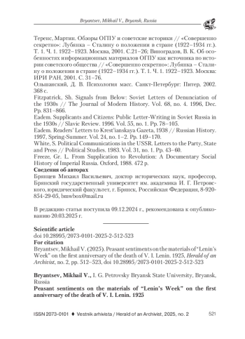 6. Теренс, Мартин. Обзоры ОГПУ и советские историки // “Совершенно секретно”: Лубянка - Сталину о положении в стране (1922-1934 гг.). Т. 1. Ч. 1. 1922-1923. Москва, 2001. С.21-26.