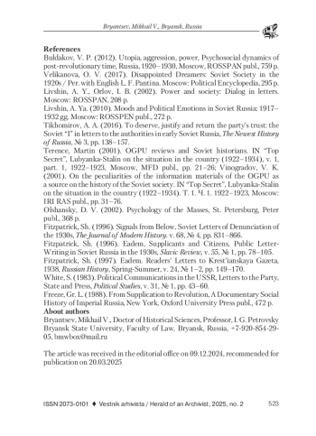 1. Булдаков, В. П. Утопия, агрессия, власть. Психосоциальная динамика постреволюционного времени. Россия, 1920-1930 гг. Москва: РОССПЭН, 2012. 759 с.