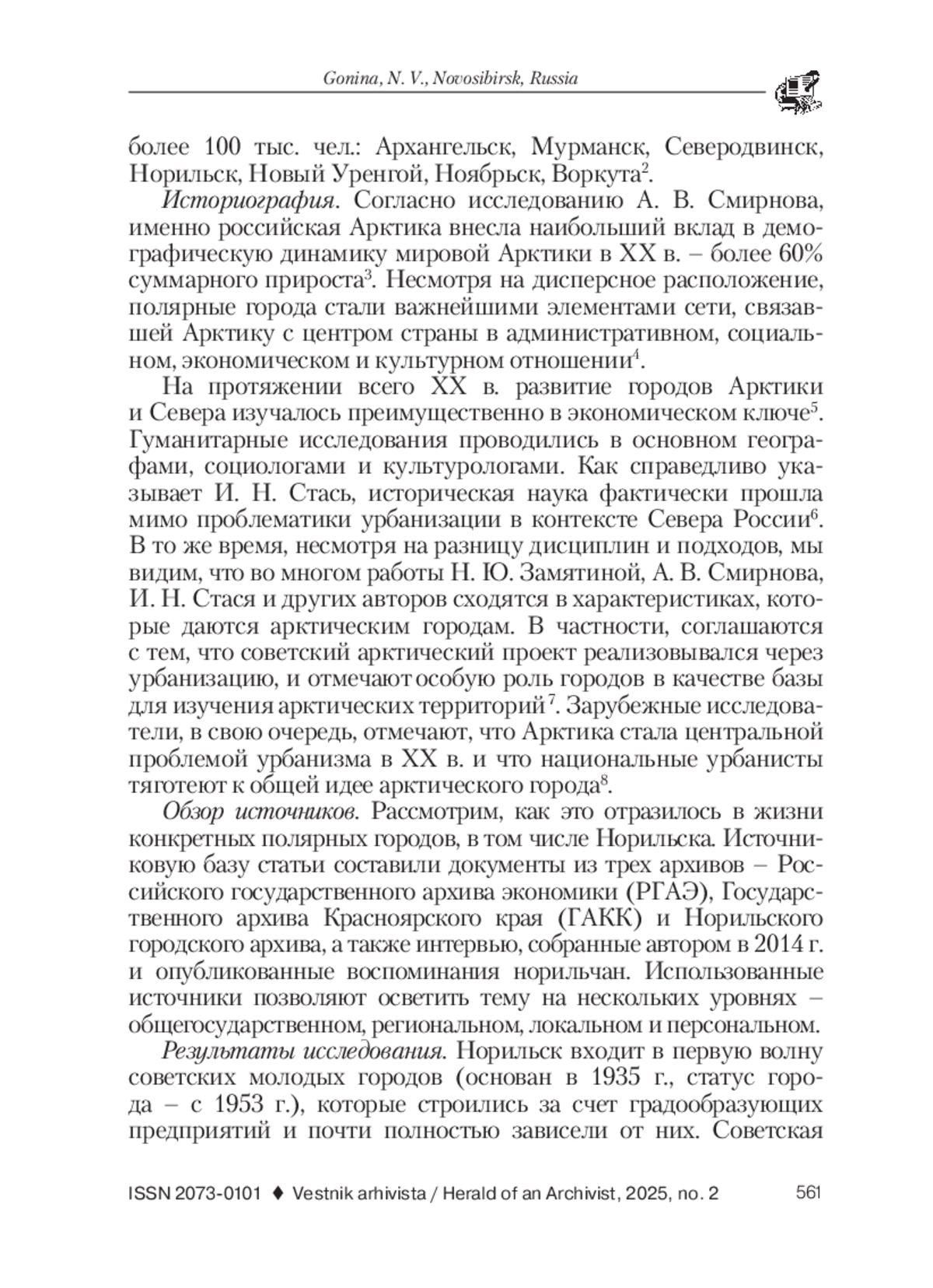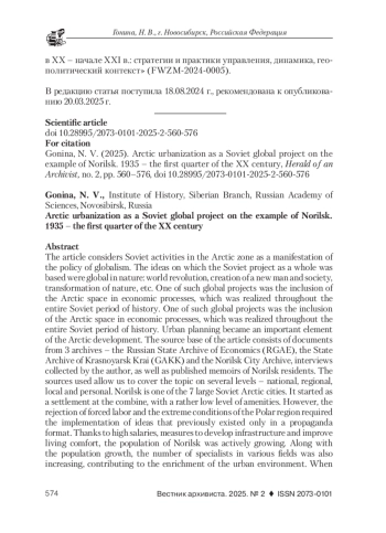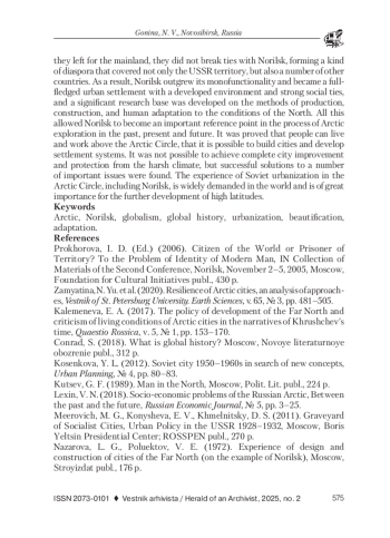 Советская деятельность в арктической зоне в статье рассматривается как проявление политики глобализма. Идеи, на которых базировался советский проект в целом, носили глобальный характер: мировая революция, создание нового человека и общества, преобразование природы и др. Одним из таких глобальных проектов было включение арктического пространства в экономические процессы, которое реализовывалось в течение всего советского периода истории. Важным элементом освоения Арктики стало градостроительство. Источниковую базу статьи составили документы из трех архивов - Российского государственного архива экономики (РГАЭ), Государственного архива Красноярского края (ГАКК) и Норильского городского архива, интервью, собранные автором, а также опубликованные воспоминания норильчан. Использованные источники позволяют осветить тему на нескольких уровнях - общегосударственном, региональном, локальном и персональном. Норильск - один из семи больших советских арктических городов. Он начинался как поселение при комбинате, с достаточно низким уровнем благоустройства. Однако отказ от принудительного труда и экстремальные условия Заполярья потребовали воплощения в жизнь идей, ранее существовавших только в пропагандистском формате. Благодаря высоким зарплатам, мерам по развитию инфраструктуры и повышению комфортности проживания, население Норильска активно росло. Одновременно с увеличением численности населения возрастало и количество специалистов различного профиля, которые вносили свою лепту в обогащение городской среды. Уезжая «на материк», они не порывали связи с Норильском, формируя своеобразную диаспору, которая охватила не только территорию СССР, но и ряд других стран. В итоге Норильск перерос свою монофункциональность и стал полноценным городским поселением с развитой средой и крепкими социальными связями, была наработана значительная исследовательская база по способам производства, строительства и адаптации человека к условиям Севера. Все это позволило Норильску стать важным опорным пунктом в процессе освоения Арктики в прошлом, настоящем и будущем. Было доказано, что человек может жить и работать за Полярным кругом, что можно строить города и развивать системы расселения. Достичь полного благоустройства города и защиты от сурового климата не удалось, однако были найдены удачные решения целого ряда важных вопросов. Опыт советской урбанизации в Заполярье, и в том числе норильский, широко востребован в мире и имеет большое значение для дальнейшего освоения высоких широт.