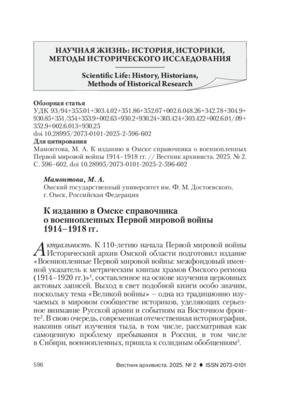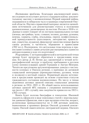 Актуальность. К 110-летию начала Первой мировой войны Исторический архив Омской области подготовил издание «Военнопленные Первой мировой войны: межфондовый именной указатель к метрическим книгам храмов Омского региона (1914–1920 гг.)»1, составленное на основе изучения церковных актовых записей. Выход в свет подобной книги особо значим, поскольку тема «Великой войны» – одна из традиционно изучаемых в мировом сообществе историков, уделяющих серьезное внимание Русской армии и событиям на Восточном фронте2. В свою очередь, современная отечественная историография, накопив опыт изучения тыла, в том числе, рассматривая как самоценную проблему пребывания в России, в том числе в Сибири, военнопленных, пришла к солидным обобщениям
