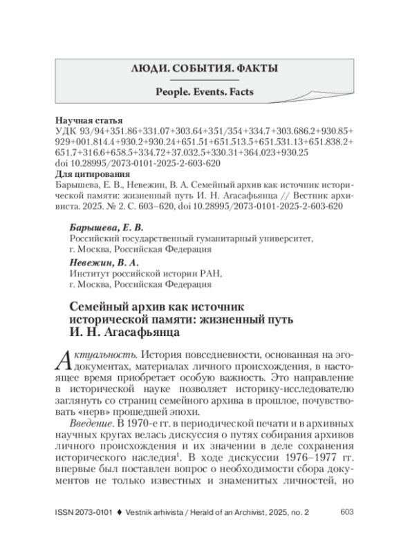 В статье на материалах семейного архива Ивана Нестеровича Агасафьянца (1891-1959) с привлечением материалов Российского государственного архива экономики (РГАЭ) и Архива внешней политики РФ (АВП РФ) рассматриваются страницы истории нашей страны (СССР) через историю боевого и трудового пути участника Гражданской войны, сотрудника «Интуриста», одного из организаторов дипломатических приемов, работника культуры. Среди сохранившихся материалов кадровые документы: личный листок, анкеты, а также удостоверения, характеристики, письма и записки. В годы Гражданской войны И. Н. Агасафьянц занимался снабжением Красной армии и партизанских формирований, в 1920-1930-е гг. - в системе Госкино: возобновил демонстрацию кинофильмов в Москве, был директором кинотеатра «Художественный». В Великую Отечественную войну принимал участие в организации обслуживания аккредитованных в СССР дипломатических представительств и военных миссий стран - союзников по антигитлеровской коалиции и представителей нейтральных государств. По заданию наркома внешней торговли СССР А. И. Микояна организовал работу и возглавил в должности директора ресторан «Гранд-Отель» в г. Куйбышеве, в который в 1941 г. были эвакуированы дипломаты и аккредитованные журналисты союзных стран. Принимал участие в обслуживании делегаций в ходе Ялтинской и Потсдамской конференций. В послевоенный период занимал руководящие посты в системе Министерства торговли СССР. Его вкладом в развитие советской торговли стало создание ряда ресторанов в Москве, в том числе и самого известного ресторана на Всероссийской сельскохозяйственной выставке (ВСХВ) «Золотой колос». Много времени уделял и подготовке молодых кадров, передавая им свои знания и опыт. В судьбе И. Н. Агасафьянца нашли отражение многие события советской эпохи. Пример изучения источников личного происхождения, хранящихся в семейных архивах, подтверждает значимость этих документов как исторических источников в изучении истории нашей страны. История повседневности, как и история семьи, основываются на изучении эго-документов. Многие из них хранятся в семейных архивах и свидетельствуют об участии граждан в тех или иных исторических событиях. Ценность уникальных документов семейных архивов как исторических источников заключена в их внимании к жизням и судьбам не только выдающихся государственных деятелей, представителей научной и творческой интеллигенции, но и «рядовых» свидетелей и участников исторических событий.