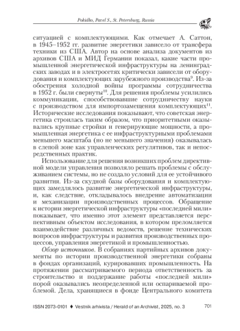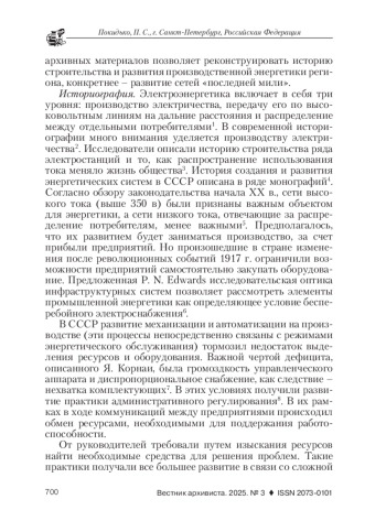 В статье отмечается, что в зарубежной и российской историографии остается малоисследованной история энергетической инфраструктуры. В собраниях архивных фондов многочисленные материалы по этой тематике не выделены в отдельные дела. Документация энергетической инфраструктуры рассредоточена по описям о строительстве и обслуживании электростанций, эксплуатации промышленных предприятий. Для анализа материалов автором использовались логический, хронологический, типологический методы, что позволило структурировать материал, проследить, как строительство электростанций стало причиной урезания финансирования строительства сетей и подстанций. Автором изучены особенности коммуникации между партийными организациями, Советом министров СССР и предприятиями, что сказывалось на развитии промышленной энергетики. Исследование позволяет рассмотреть, как в условиях ограниченных ресурсов происходило развитие энергетической инфраструктуры. На примере материалов из архивов федерального уровня - Российского государственного архива социально-политической истории (РГАСПИ), Государственного архива Российской Федерации (ГАРФ), Российского государственного архива экономики (РГАЭ), Российского государственного архива новейшей истории (РГАНИ), показано, как невнимание союзных властей к проблемам «последней мили» стало причиной систематических потерь электроэнергии. Документы в региональных архивах: Центральном государственном архиве историко-политической документации в Санкт-Петербурге (ЦГАИПД СПб), Центральном государственном архиве Санкт-Петербурга (ЦГА СПБ), Ленинградском областном государственном архиве в Выборге (ЛОГАВ) иллюстрируют взаимоотношения энергоснабжающей организации и предприятий города и области, показывают, как профильные министерства участвовали в решении рассматриваемых проблем, а также иллюстрируют отдельные аспекты экономики электросетевого хозяйства. Названные фонды позволяют рассмотреть процедуры обеспечения промышленной энергетики - от принятия решений до проведения работ по совершенствованию инфраструктуры «последней мили» на предприятии. Показано, как выделение обслуживания сетей в отдельное направление работы областных советов создавало условия для роста энерговооруженности предприятий. Анализируя процесс развития энергетической инфраструктуры, в рамки которого входило увеличение снабжения электричеством предприятий, автор показывает, как строительство подстанций и развитие сетей позволяло механизировать производственные процессы. Выводы автора подтверждаются архивными документами.