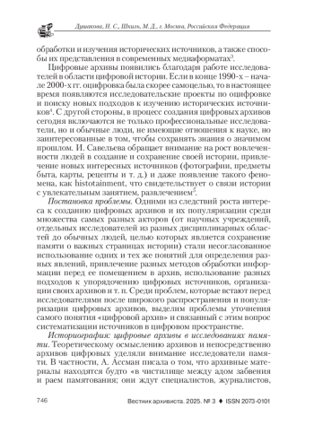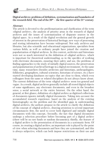 Статья посвящена проблематизации и уточнению термина «цифровой архив», анализу приоритетных направлений в исследованиях цифровых архивов и вопросам систематизации разрозненных источников в цифровом пространстве. Следствием цифрового поворота и всеобщего роста интереса к сохранению исторического наследия стало распространение новых способов обработки и хранения информации. В создание и популяризацию цифровых архивов включились не только архивы и библиотеки, но и научно-образовательные организации, специалисты из разных областей, а также обычные люди. В этом контексте архивистов и историков не столько интересовало важное для теоретического осмысления определение понятия «цифровой архив», сколько специфика работы с электронными документами, обеспечение их сохранности и использования, проблемы поиска подходов к изучению изначально цифровых источников, сохранение и популяризация архивного наследия в цифровой среде. В то же время многие исследователи (кроме архивистов и историков, еще антропологи, фольклористы, географы, культурологи, историки науки и др.) занялись разработкой баз данных на близкую для них тематику, о чем не всегда знают даже коллеги из тех же или смежных дисциплин. Существующие на сегодняшний день определения термина «цифровой архив» видятся слишком общими и расплывчатыми. Как следствие, к цифровым архивам относят вообще все сохраняемые цифровые объекты, имеющие какую-то значимость, любые электронные документы и даже в самом широком смысле социальную сеть или всю сеть Интернет. С другой стороны, общее, на первый взгляд, определение цифрового архива как оцифрованных коллекций документов упускает из своего внимания изначально цифровые документы. Учитывая накопленный опыт исследований, на основе анализа существующей историографии по проблеме и выявленных пробелов в осмыслении цифровых архивов авторы предлагают в статье уточнить определение понятия «цифровой архив», обращая внимание на несколько важных обстоятельств: первое, необходимость охватить этим понятием как оцифрованные, так и изначально цифровые документы; второе, тот факт, что цифровые документы проходят процедуру отбора перед тем, как стать частью цифрового архива (здесь не будет необработанных фондов или случайных документов); третье, то, что особенностью цифрового архива является представление документов в систематизированном виде. Безусловно, в создании цифрового архива важную роль играет точка зрения при отборе документов и способе их систематизации, а это всегда субъективно, что может как накладывать ограничения на их использование, так и открывать дополнительные возможности. Авторы формулируют определение понятия «цифровой архив» как набор оцифрованных или созданных в цифровом формате документов, отобранных для хранения и представленных в систематизированном виде. Одним из возможных решений проблемы разрозненности цифровых источников (как оцифрованных, так и изначально цифровых) видится создание и размещение в открытом доступе сводного каталога цифровых архивов, над которым работает коллектив авторов в Архиве РАН.