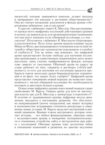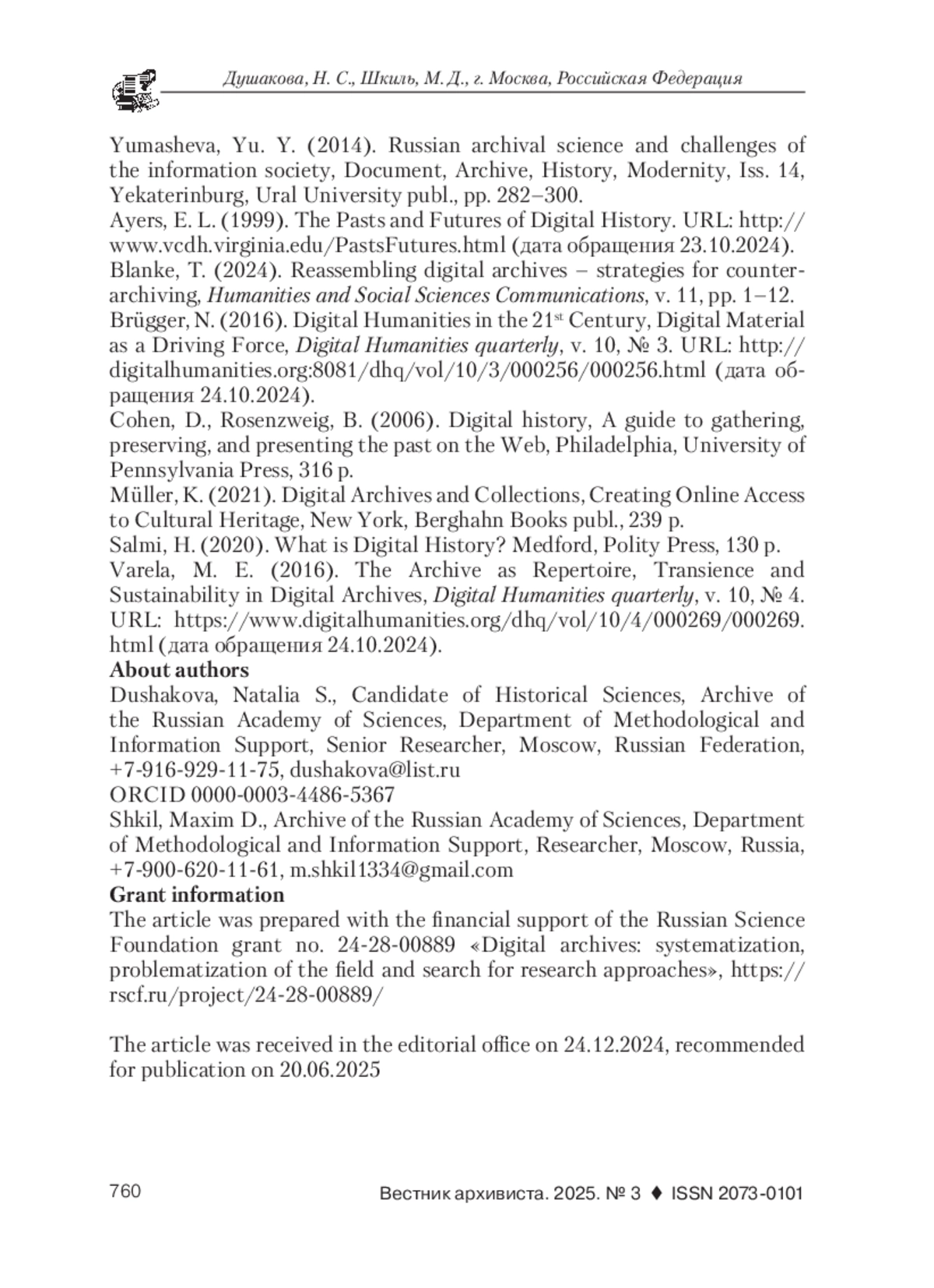 18. Salmi, H. (2020). What is Digital History? Medford, Polity Press, 130 p. Varela, M. E. (2016). The Archive as Repertoire, Transience and Sustainability in Digital Archives, Digital Humanities quarterly, v. 10, № 4. URL: https://www.digitalhumanities.org/dhq/vol/10/4/000269/000269.html (дата обращения 24.10.2024).