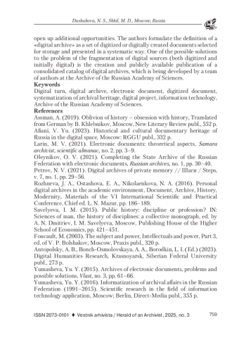 4. Олейников, О. В. Комплектование Государственного архива Российской Федерации электронными документами // Отечественные архивы. 2021. № 1. С. 30-40.