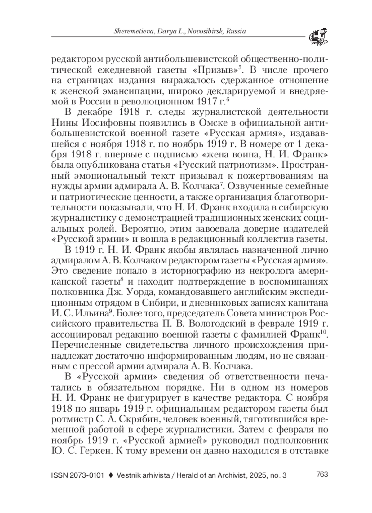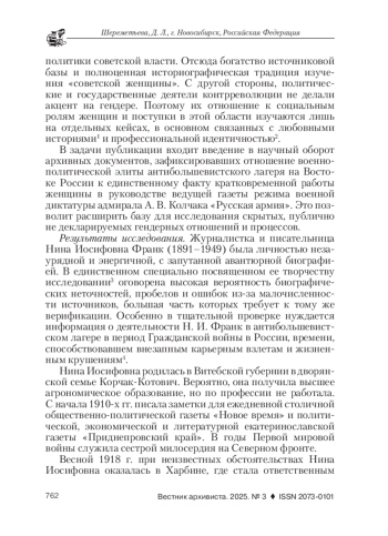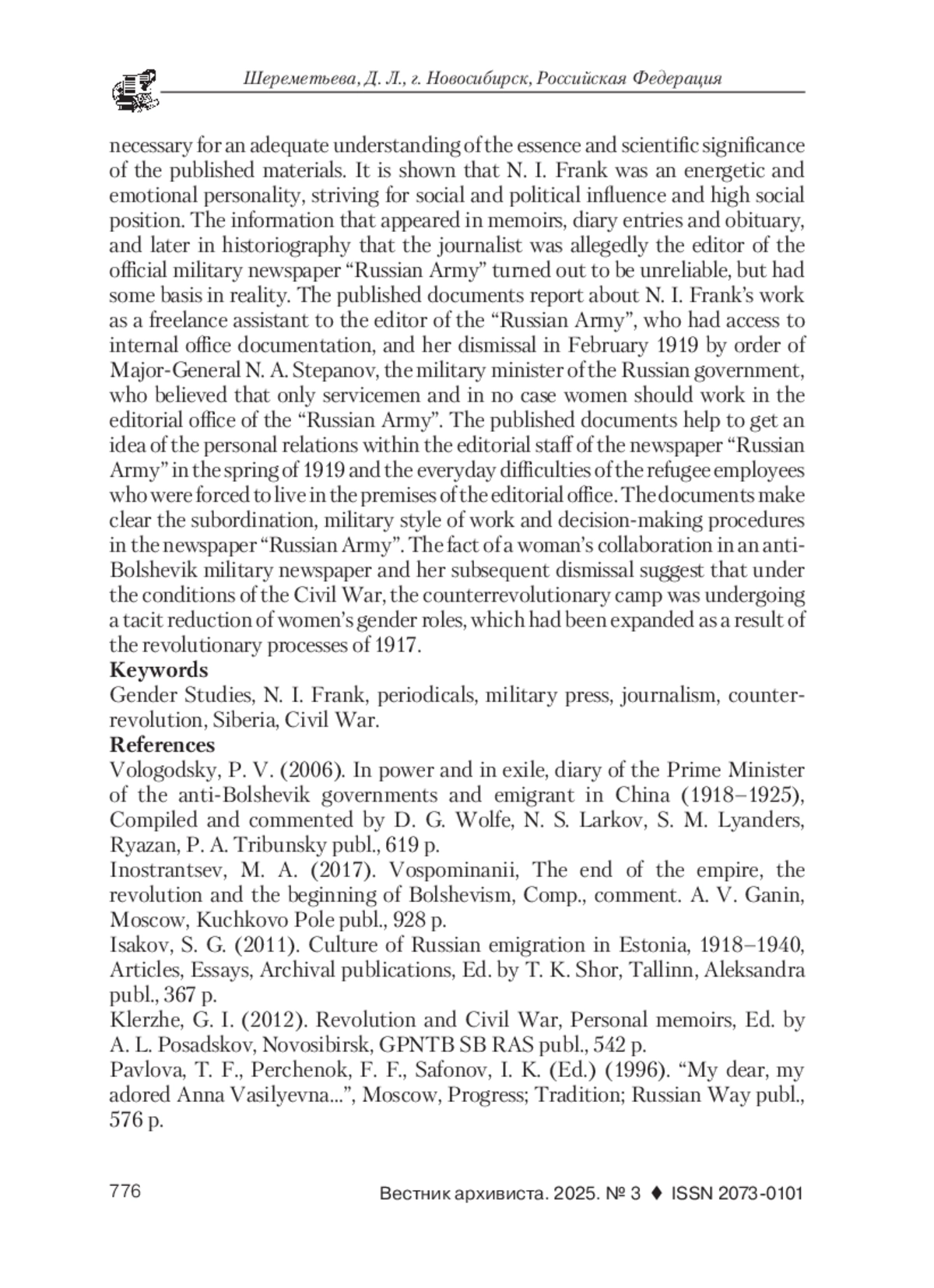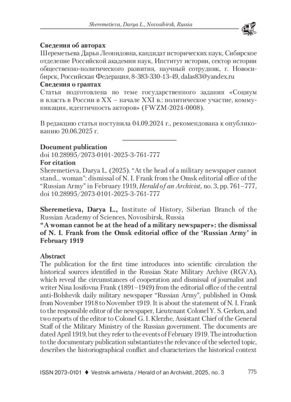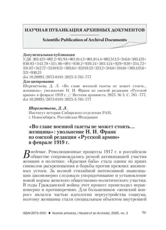 В публикации впервые вводятся в научный оборот выявленные в Российском государственном военном архиве (РГВА) исторические источники, которые раскрывают обстоятельства сотрудничества и увольнения журналистки и писательницы Нины Иосифовны Франк (1891-1949) из редакции центральной антибольшевистской ежедневной военной газеты «Русская армия», издававшейся в Омске с ноября 1918 г. по ноябрь 1919 г. Речь идет о заявлении Н. И. Франк на имя ответственного редактора газеты подполковника Ю. С. Геркена и двух рапортах редактора помощнику начальника Главного штаба Военного министерства Российского правительства полковнику Г. И. Клерже. Документы датированы апрелем 1919 г., однако речь в них идет о событиях февраля 1919 г. Во введении к документальной публикации обоснована актуальность избранной темы, описана историографическая коллизия и охарактеризован исторический контекст, необходимый для адекватного понимания сути и научной значимости публикуемых материалов. Показано, что Н. И. Франк была личностью энергичной и эмоциональной, стремившейся к общественно-политическому влиянию и высокому социальному положению. Попавшие в мемуары дневниковые записи и некролог, а затем в историографию сведения о том, что журналистка якобы являлась редактором официальной военной газеты «Русская армия», оказались недостоверными, но имевшими некоторые основания в действительности. В публикуемых документах сообщается о работе Н. И. Франк в должности внештатной помощницы редактора «Русской армии», имевшей доступ к внутренней делопроизводственной документации, а также о ее увольнении в феврале 1919 г. по распоряжению военного министра Российского правительства генерал-майора Н. А. Степанова, считавшего, что в редакции «Русской армии» должны работать только военнослужащие и ни в коем случае женщины. Публикуемые документы помогают составить представление о личных отношениях внутри редакционного коллектива газеты «Русская армия» весной 1919 г. и бытовых трудностях сотрудников-беженцев, вынужденных жить в помещениях редакции. Из документов становятся ясными субординация, военный стиль работы и порядок принятия решений в газете «Русская армия». Факт сотрудничества женщины в антибольшевистской военной газете и последовавшее увольнение дают основание предположить, что в условиях Гражданской войны в лагере контрреволюции происходила негласная редукция женских гендерных ролей, расширенных в результате революционных процессов 1917 г.