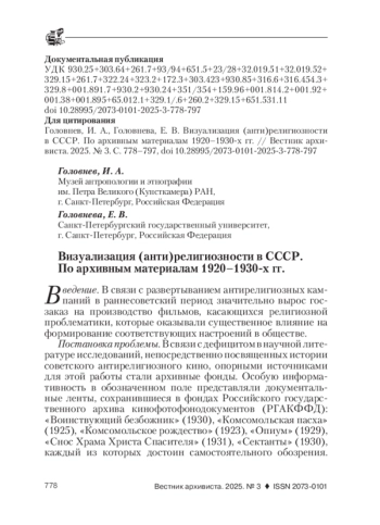 Один из главных парадоксов отечественной истории - превращение России из самой религиозной европейской страны начала XX в. в официально атеистическое государство после революции 1917 г. - до сих пор не получил должного научного осмысления. В частности, оказался обойден вниманием важный аспект о роли и форматах визуализации советской политики при реализации антирелигиозных программ, хотя именно образный строй оказывал определяющее влияние на реформирование религиозных настроений среди малограмотных народных масс - целевой аудитории новой власти. Не случайно ресурсы набиравшего популярность кинематографа активно использовались государственными идеологами в качестве экранной кафедры - для проповедования социалистических заповедей, сакрализации пролетарских ритуалов, иконизации партийных вождей. Представляемая статья фокусируется на опытах конструирования «большевизма как религии» в наиболее показательных проекциях: науки, музея и кинематографа. Публикация отвечает спектру задач: введение в научный оборот тематических архивных кинодокументов, их сопоставление с соответствующими разработками из текстовых архивов ученых и материалами из раннесоветской периодики, а также их историко-антропологический анализ в ключе современных религиоведческих работ. Индикатором новизны является кроссдисциплинарная проблематика предпринимаемого исследования, охватывающая вопросы экранного конструирования атеистической идеологии и формирование феномена «храма-музея». В ходе изучения истории создания, а также деталей экспозиции Государственного антирелигиозного музея, запечатленных в архивном кинофильме «В антирелигиозном музее» (1938), рассматриваются свидетельства о бытовании различных подходов к религии и церкви в пост-революционном российском обществе. Делается вывод о значимости визуальных архивов как исторических источников, которые вкупе с соответствующими письменными материалами открывают качественно большие возможности для эффективного исследования многоплановых и противоречивых явлений отечественной истории. Актуализация опытов визуальной репрезентации антирелигиозности в СССР 1920-1930-х гг. имеет вариативную научную значимость: сохранившиеся в архивах документы позволяют реконструировать остававшиеся «за кадром» официальных хроник научно-творческие подходы к решению идеологических задач, оценить специфику межведомственных проектов атеистического просвещения, рассмотреть нюансы реакции на них со стороны групп населения, увидеть образы пестрого атласа конфессий страны Советов.
