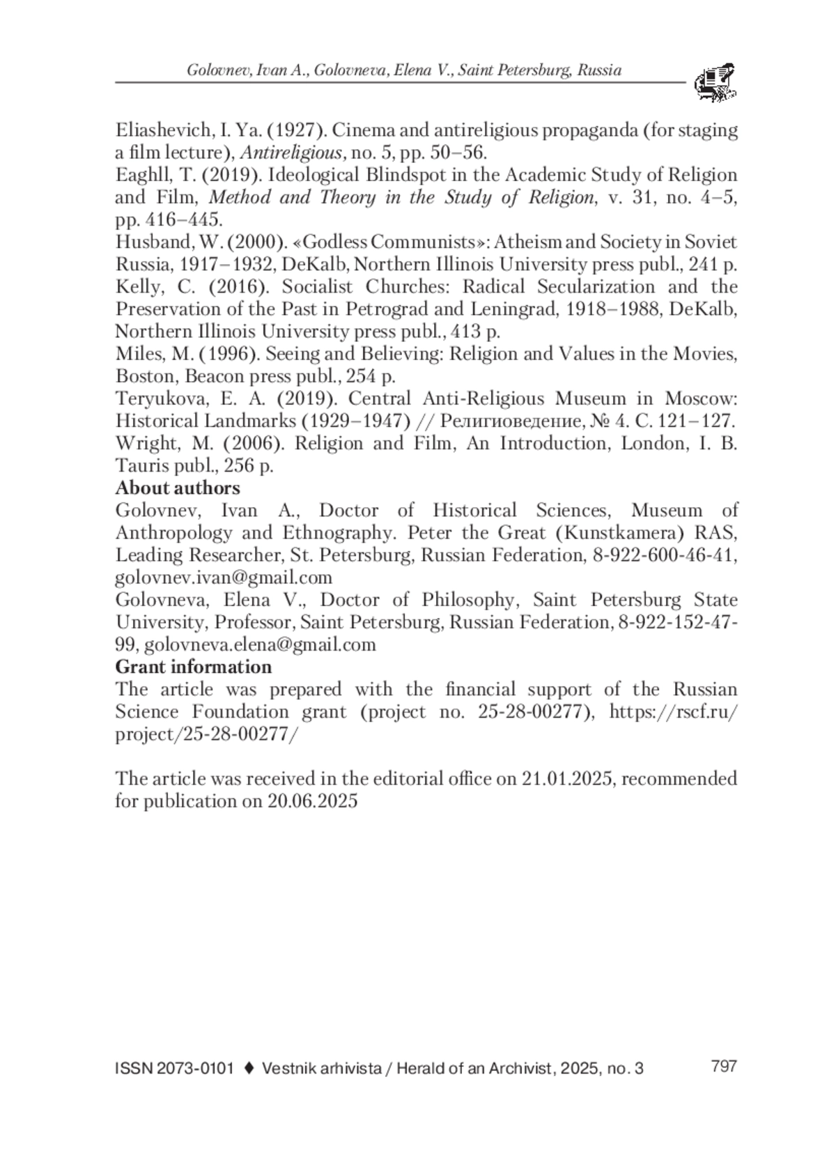 6. Пальшкова, М. А. Особенности атеистического дискурса в кинематографе “воинствующего безбожия” 1920-х гг. // Вестник ВГИК. 2024. № 1. С. 41-57. EDN: MHXWXB