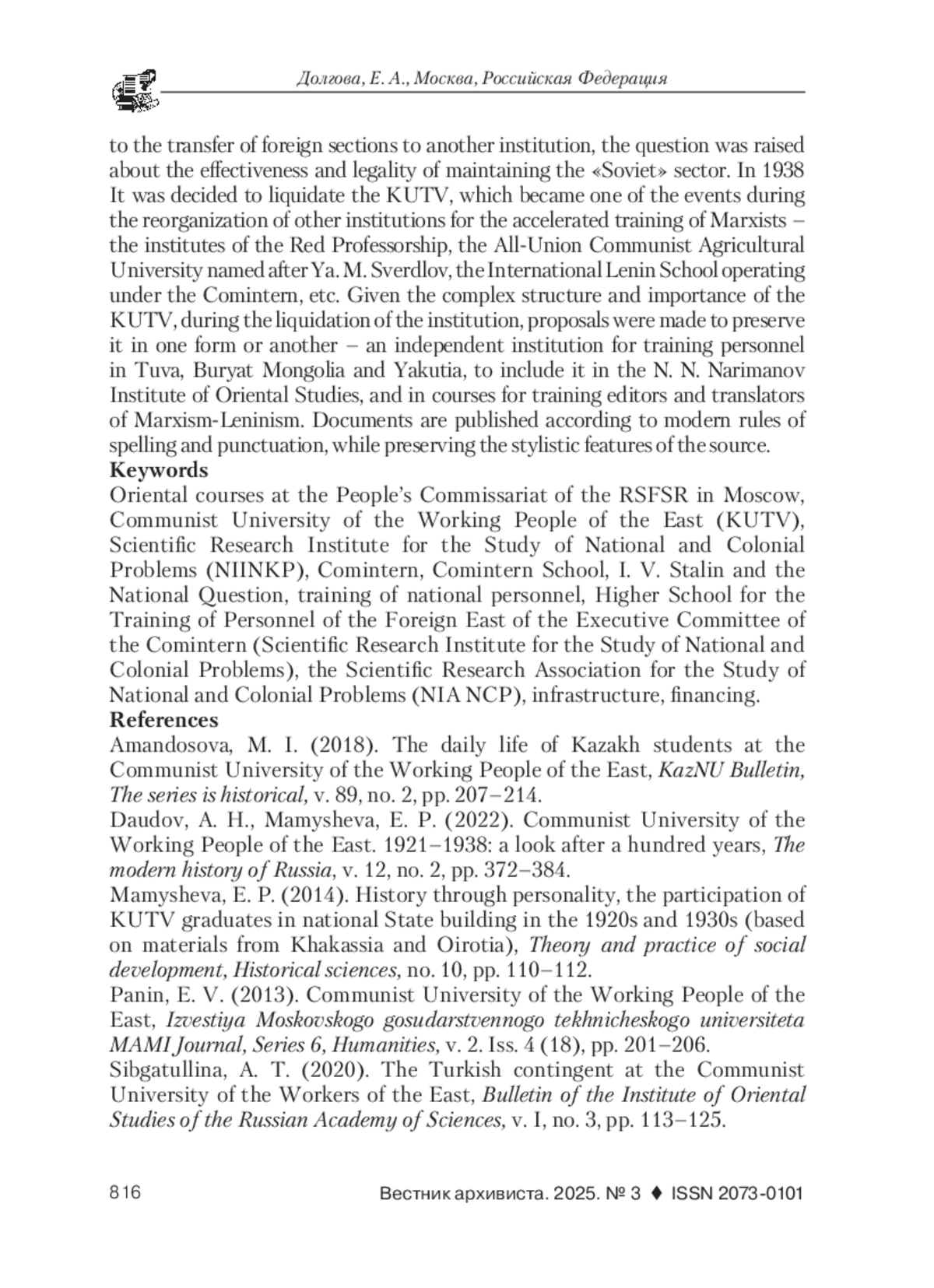 2. Даудов, А. Х., Мамышева, Е. П. Коммунистический университет трудящихся Востока. 1921-1938 гг.: взгляд через сто лет // Новейшая история России. 2022. Т. 12. № 2. С. 372-384. EDN: WWJMTN