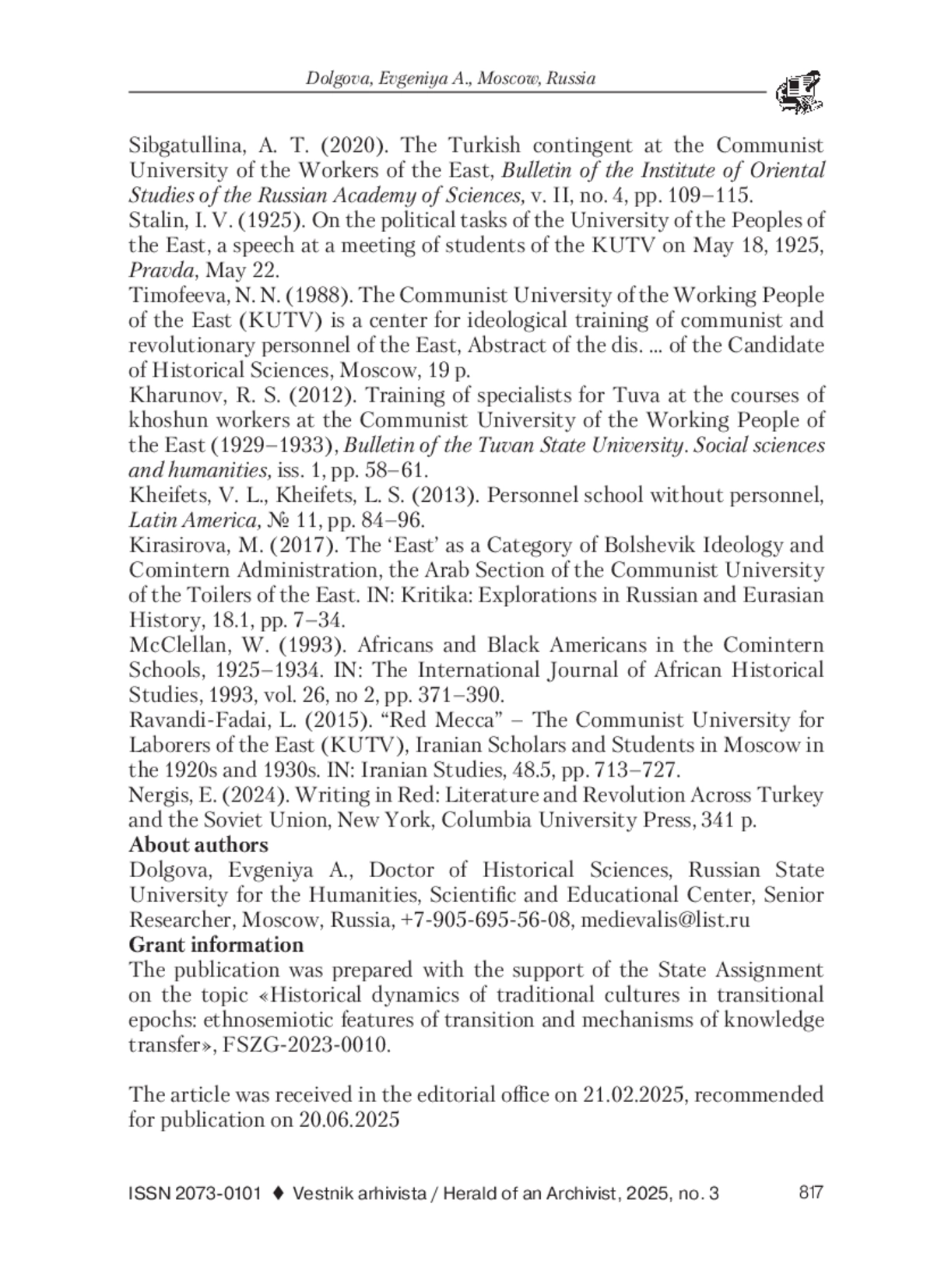 13. Ravandi-Fadai, L. (2015). “Red Mecca” - The Communist University for Laborers of the East (KUTV), Iranian Scholars and Students in Moscow in the 1920s and 1930s. IN: Iranian Studies, 48.5, pp. 713-727.