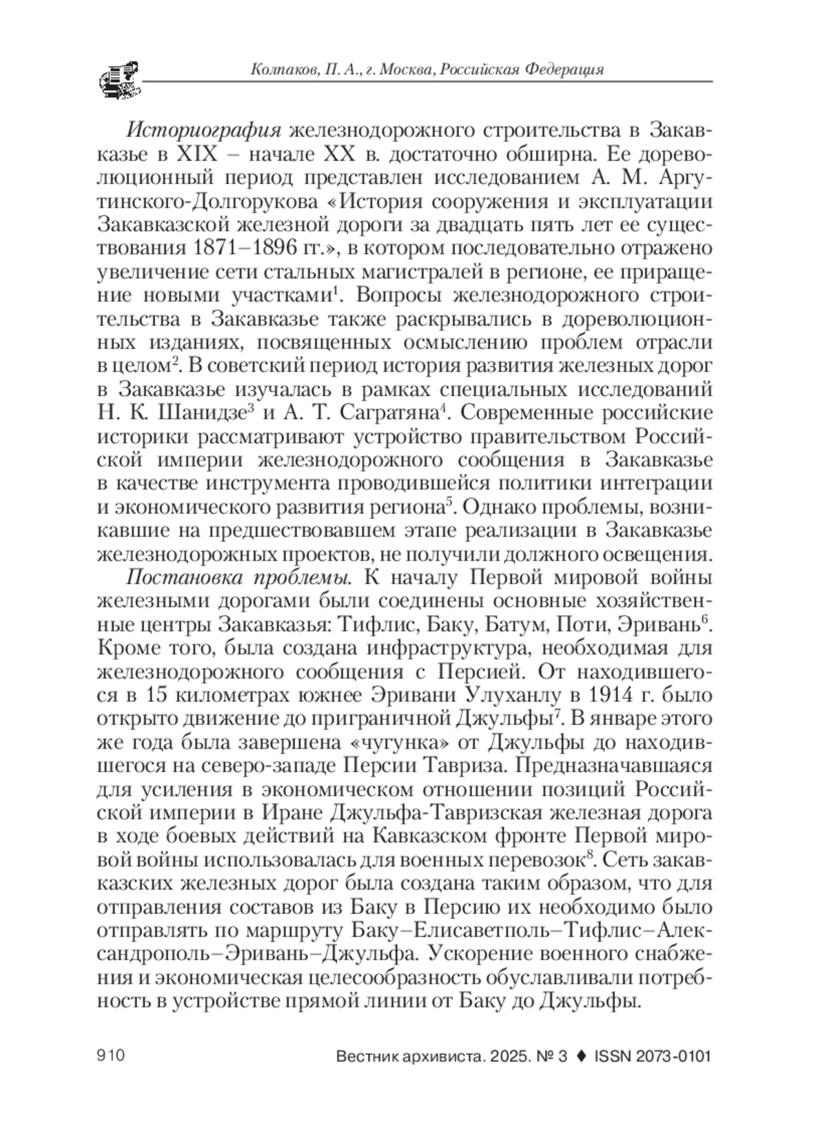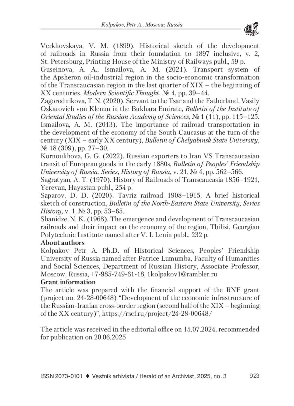6. Исмаилова, А. М. Значение железнодорожного транспорта в развитии экономики Южного Кавказа на рубеже веков (XIX - начало XX в.) // Вестник Челябинского государственного университета. 2013. № 18 (309). С. 27-30.