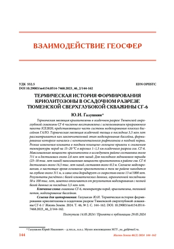 Термическая эволюция криолитозоны в осадочном разрезе Тюменской сверхглубокой скважины СГ-6 численно восстановлена с использованием программного пакета ICE2020, представляющего часть системы моделирования плоских бассейнов ГАЛО. Термическая эволюция осадочной толщи в последние 3,5 млн лет рассматривается как заключительный этап моделирования бассейна, формирование которого началось с континентального рифтогенеза в поздней перми. Резкие изменения климата в позднем плиоцене–голоцене привели к снижению температуры пород на 15–20 °C в верхних 1–1,5 км осадочного разреза скв. СГ-6. Максимальная мощность криолитозоны в исследуемом районе составляла около 711 м и достигалась около 2,6 млн лет назад. Для последнего ледникового периода (23–18 тыс. лет назад) максимальная мощность криолитозоны в районе скв. СГ-6 достигалась около 14,5 тыс. лет назад, составляя около 412 м. Согласно моделированию, в настоящее время основание криолитозоны в том же районе находится на глубине около 311 м, и сама зона деградирует со скоростью около 13 м/1000 лет. Результаты расчётов с базой климатических данных, ограниченной последними 50 и 100 тыс. лет, заметно отличаются от результатов моделирования с полной базой данных за последние 3,5 млн лет
