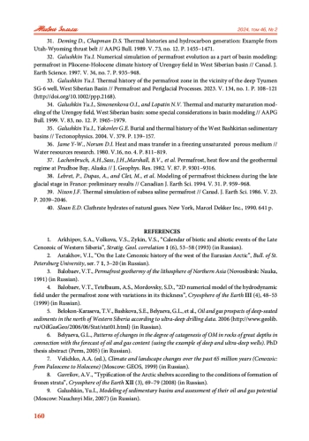 32. Galushkin Yu.I. Numerical simulation of permafrost evolution as a part of basin modeling: permafrost in Pliocene-Holocene climate history of Urengoy field in West Siberian basin // Canad. J. Earth Science. 1997. V. 34, no. 7. P. 935-948. EDN: LEEQNL