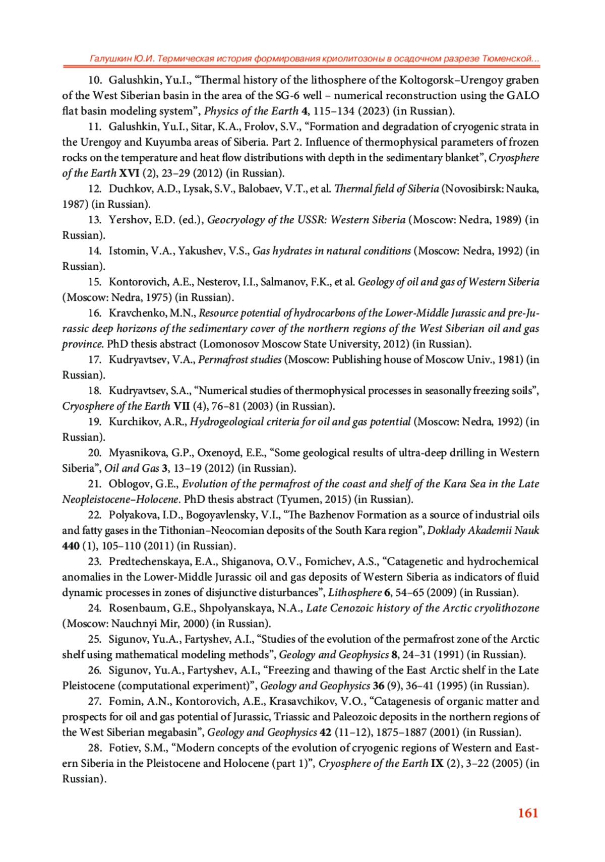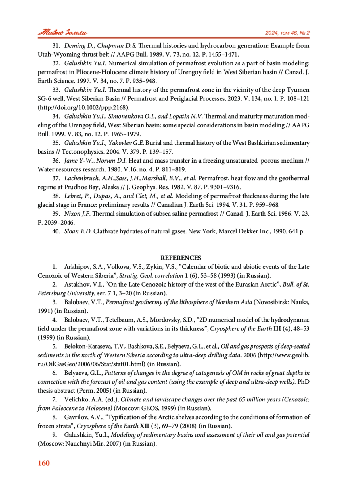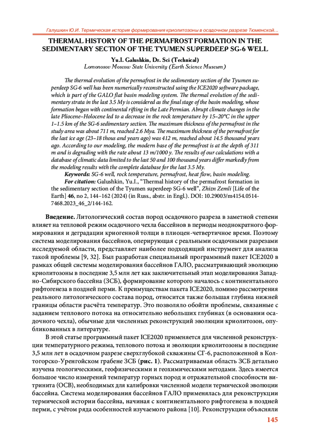 33. Galushkin Yu.I. Thermal history of the permafrost zone in the vicinity of the deep Tyumen SG-6 well, West Siberian Basin // Permafrost and Periglacial Processes. 2023. V. 134, no. 1. P. 108-121. DOI: 10.1002/ppp.2168 EDN: ETOEDE