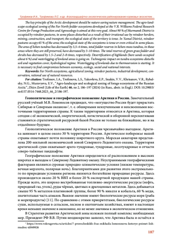 Ключевым принципом развития Арктики должно стать природосберегающее природопользование. Именно на это нацелено разработанное в ФНЦ кормопроизводства и агроэкологии им. В. Р. Вильямса агроландшафтно-экологическое районирование кормовых экосистем Крайнего Севера. Около 90 % площади Мурманского округа занимают оленьи пастбища, местами нарушенные в результате нерационального использования оленеводами, добычей полезных ископаемых, строительством, транспортом; экологическое состояние территории напряжённое. В Ямальском округе оленьи пастбища занимают 65 % площади; экологическое состояние экосистем напряжённое, местами кризисное. Площадь лишайниковых тундр сократилась в 3,5–4 раза, общие запасы кормов в лишайниково-моховых тундрах, на тех участках, где они ещё сохранились, сократились в 3–10 раз. Общие запасы зелёных травяных кормов снизились в 1,5–2 раза, кустарников – в 2–8 раз. Идёт опустынивание повышенных участков (оголённые пески заняли около 6 %) и заболачивание низинных участков территории. Техногенное воздействие на тундровые экосистемы нарушает почвенно-растительный покров, гидрологический режим. Начинается заболачивание низин из-за термоэрозии. Необходим поиск компромиссов между экономикой, экологией, социальными и национальными интересами