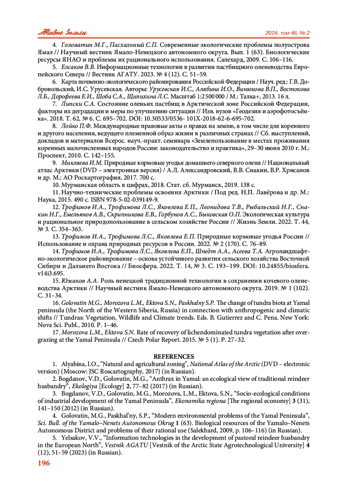 7. Липски С.А. Состояние оленьих пастбищ в Арктической зоне Российской Федерации, факторы их деградации и меры по улучшению ситуации // Изв. вузов “Геодезия и аэрофотосъёмка”. 2018. Т. 62, № 6. С. 695-702. 10.30533/0536- 101X-2018-62-6-695-702. DOI: 10.30533/0536-101X-2018-62-6-695-702 EDN: YQZAJV