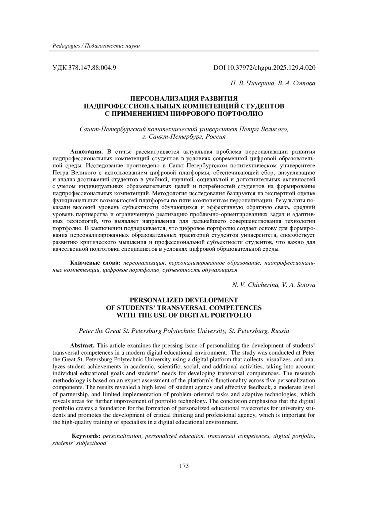 В статье рассматривается актуальная проблема персонализации развития надпрофессиональных компетенций студентов в условиях современной цифровой образовательной среды. Исследование произведено в Санкт-Петербургском политехническом университете Петра Великого с использованием цифровой платформы, обеспечивающей сбор, визуализацию и анализ достижений студентов в учебной, научной, социальной и дополнительных активностей с учетом индивидуальных образовательных целей и потребностей студентов на формирование надпрофессиональных компетенций. Методология исследования базируется на экспертной оценке функциональных возможностей платформы по пяти компонентам персонализации. Результаты показали высокий уровень субъектности обучающихся и эффективную обратную связь, средний уровень партнерства и ограниченную реализацию проблемно-ориентированных задач и адаптивных технологий, что выявляет направления для дальнейшего совершенствования технологии портфолио. В заключении подчеркивается, что цифровое портфолио создает основу для формирования персонализированных образовательных траекторий студентов университета, способствует развитию критического мышления и профессиональной субъектности студентов, что важно для качественной подготовки специалистов в условиях цифровой образовательной среды.