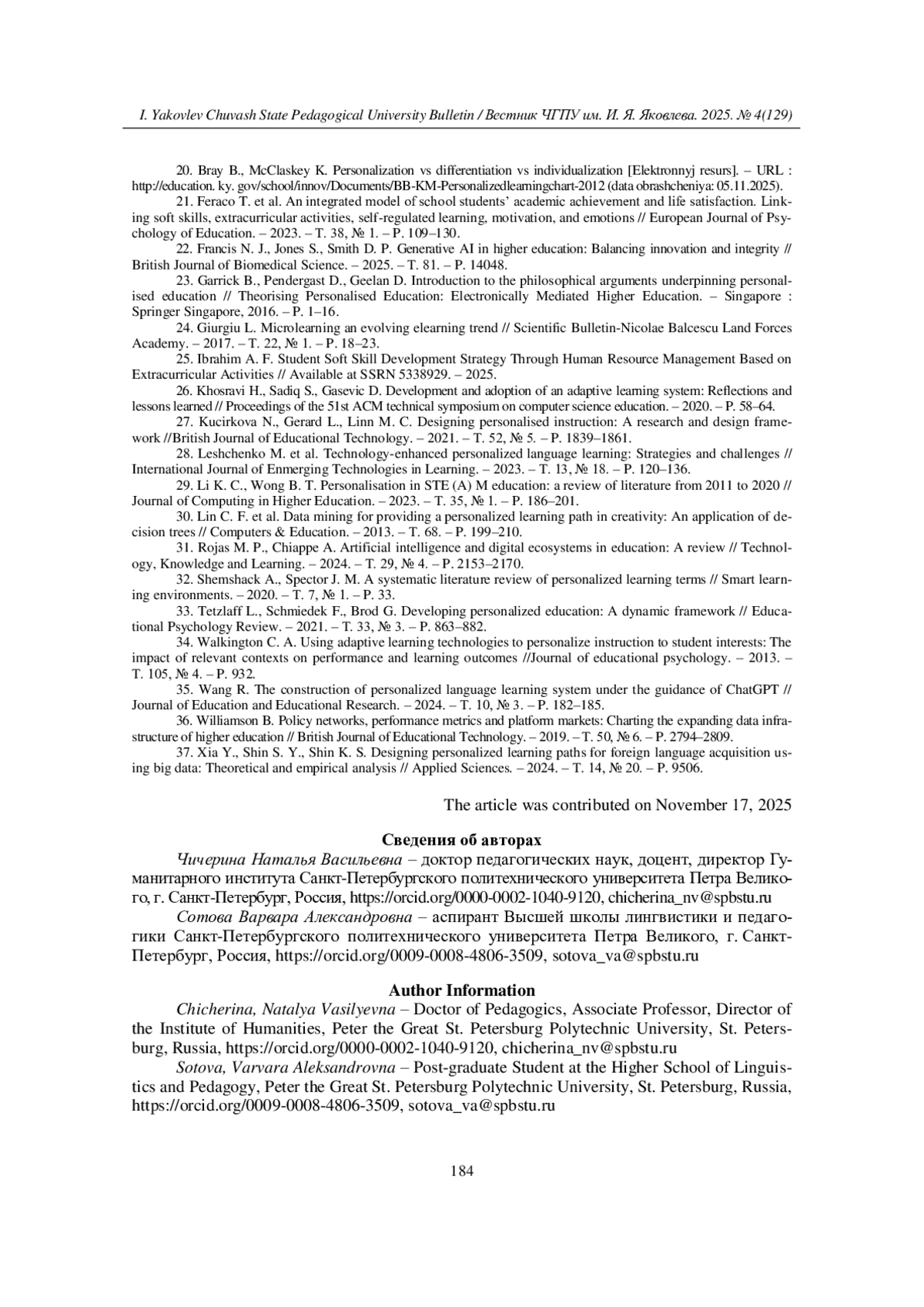 29. Li K. C., Wong B. T. Personalisation in STE (A) M education: a review of literature from 2011 to 2020 // Journal of Computing in Higher Education. - 2023. - Т. 35, № 1. - P. 186-201.