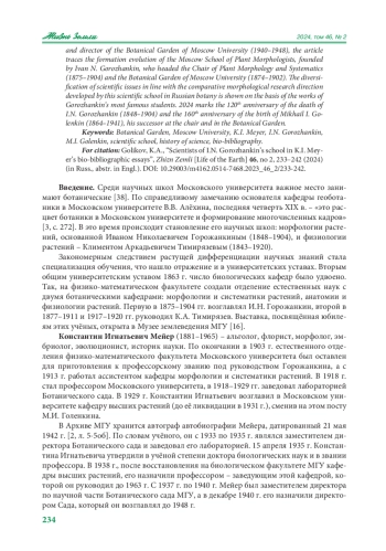 На основе биобиблиографических очерков Константина Игнатьевича Мейера (1881–1965) – заведующего кафедрой морфологии и систематики высших растений (1929–1931 и 1938–1963) и директора Ботанического сада Московского университета (1940–1948) – прослежена эволюция становления московской школы морфологов растений, основанной Иваном Николаевичем Горожанкиным, возглавлявшим кафедру морфологии и систематики растений (1875–1904) и Ботанический сад Московского университета (1874–1902). Диверсификация научной проблематики в русле разрабатываемого этой научной школой сравнительно-морфологического направления в отечественной ботанике показана на основе трудов наиболее известных учеников Горожанкина. В 2024 г. исполняется 120 лет со дня смерти И. Н. Горожанкина (1848– 1904) и 160 лет со дня рождения Михаила Ильича Голенкина (1864–1941) – его преемника по кафедре и Ботаническому саду