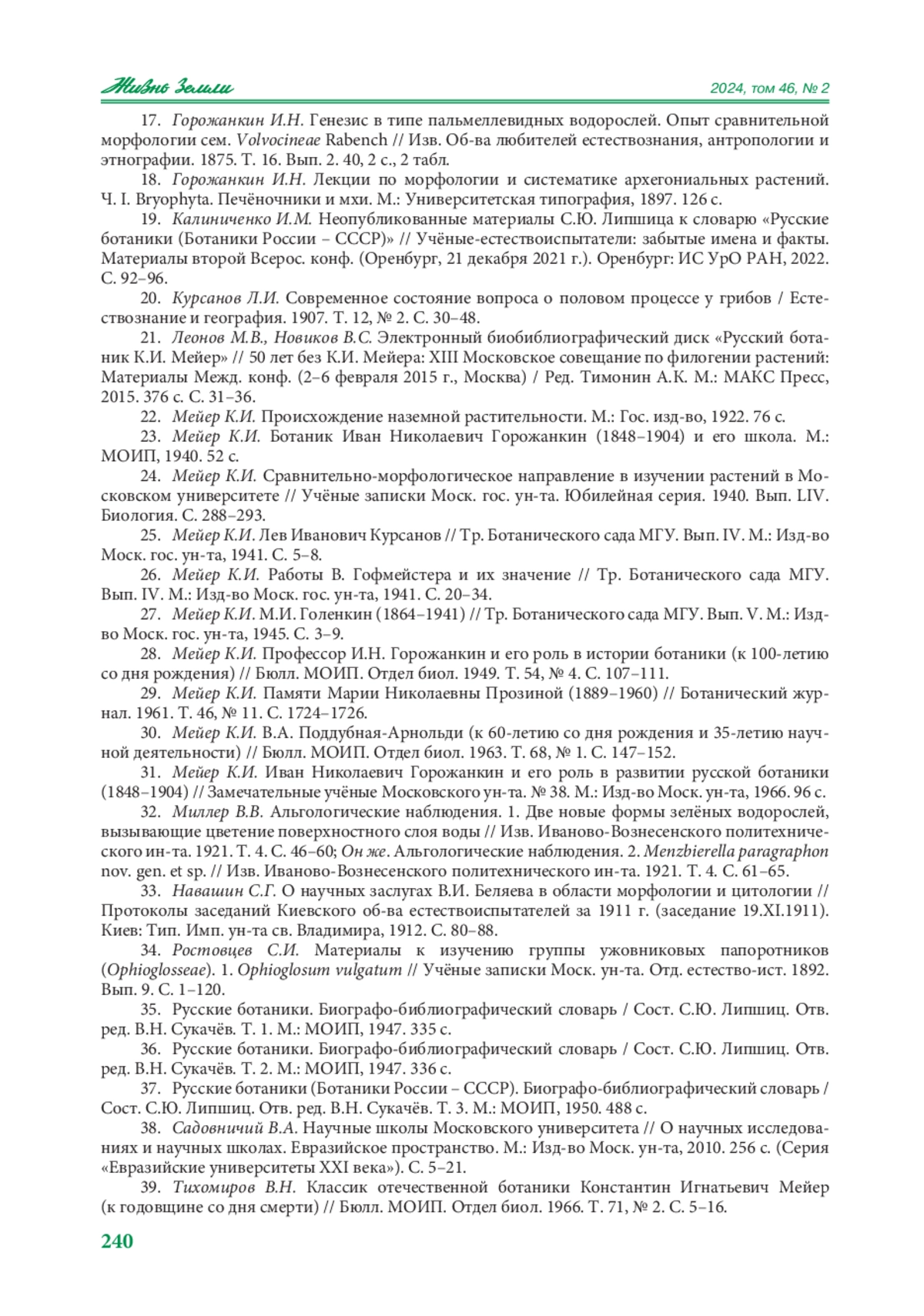 39. Тихомиров В.Н. Классик отечественной ботаники Константин Игнатьевич Мейер (к годовщине со дня смерти) // Бюлл. МОИП. Отдел биол. 1966. Т. 71, № 2. С. 5-16. 240.
