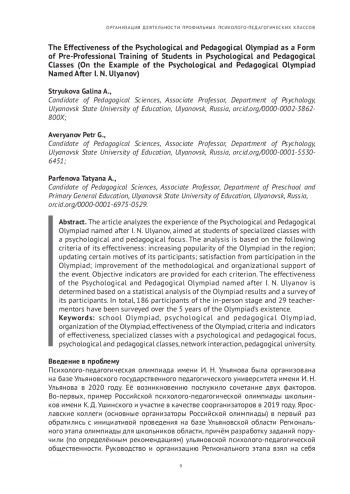 В статье производится анализ опыта Психолого-педагогической олимпиады имени И. Н. Ульянова, ориентированной на учеников профильных классов психолого-педагогической направленности. В основу анализа положены следующие критерии ее эффективности: рост популярности олимпиады в регионе; актуализация определённых мотивов её участников; удовлетворённость от участия в олимпиаде; совершенствование методического и организационного обеспечения мероприятия. Для каждого критерия приводятся объективные показатели. Эффективность Психолого-педагогической олимпиады имени И. Н. Ульянова определяется на основе статистического анализа результатов Олимпиады и опроса её участников. Всего за 5 лет существования Олимпиады опрошено 186 участников очного этапа и 29 педагогов-наставников.