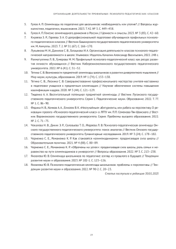 17. Яковлева Ю. В. Олимпиада школьников по педагогике: взгляд из прошлого в будущее // Тенденции развития науки и образования. 2023. № 102-1. С. 123-126. EDN: QGFBWL