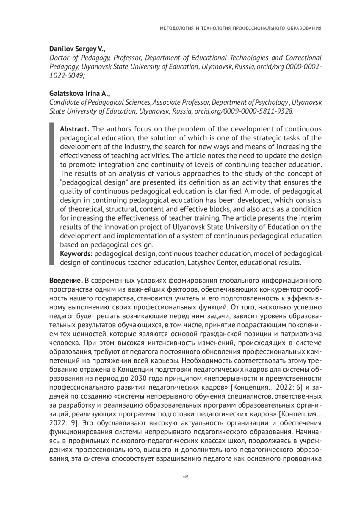 Авторы сосредотачивают внимание на проблеме развития непрерывного педагогического образования разрешение которой является одной из стратегических задач развития отрасли, поиске новых путей и способов повышения эффективности педагогической деятельности. В статье отмечается необходимость обновления дизайна, способствующего интеграции и преемственности уровней непрерывного педагогического образования. Приводятся результаты анализа различных подходов к исследованию понятия «педагогический дизайн», уточнено его определение как деятельности обеспечивающей качество непрерывного педагогического образования. Разработана модель педагогического дизайна в непрерывном педагогическом образовании, которая состоит из теоретического, структурно-содержательного и результативного блоков, а также выступает условием повышения эффективности подготовки педагогов. В статье приводятся промежуточные результаты инновационного проекта УлГПУ им. И. Н. Ульянова по разработке и внедрению системы непрерывного педагогического образования на основе педагогического дизайна.