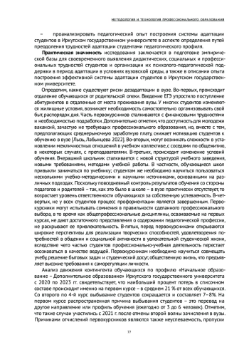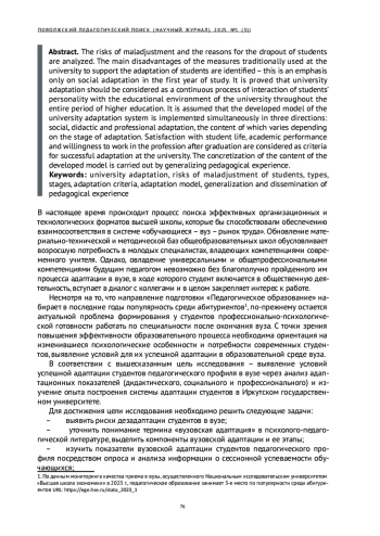 Проанализированы риски дезадаптации и причины выбывания студентов. Определены основные недостатки традиционно применяемых в вузе мер поддержки адаптации обучающихся - делается акцент на социальной адаптации в первый год обучения. Доказывается, что вузовская адаптация должна рассматриваться как непрерывный процесс взаимодействия личности студентов с образовательной средой вуза на протяжении всего срока получения высшего образования. Предполагается, что разработанная модель системы вузовской адаптации реализуется одновременно по трем направлениям: социальной, дидактической и профессиональной адаптации, содержание которых варьируется в зависимости от этапа адаптации. В качестве критериев успешной адаптации в вузе рассматриваются удовлетворенность студенческой жизнью, учебная успеваемость и готовность работать по профессии после окончания вуза. Конкретизация содержания разработанной модели осуществляется посредством обобщения педагогического опыта.