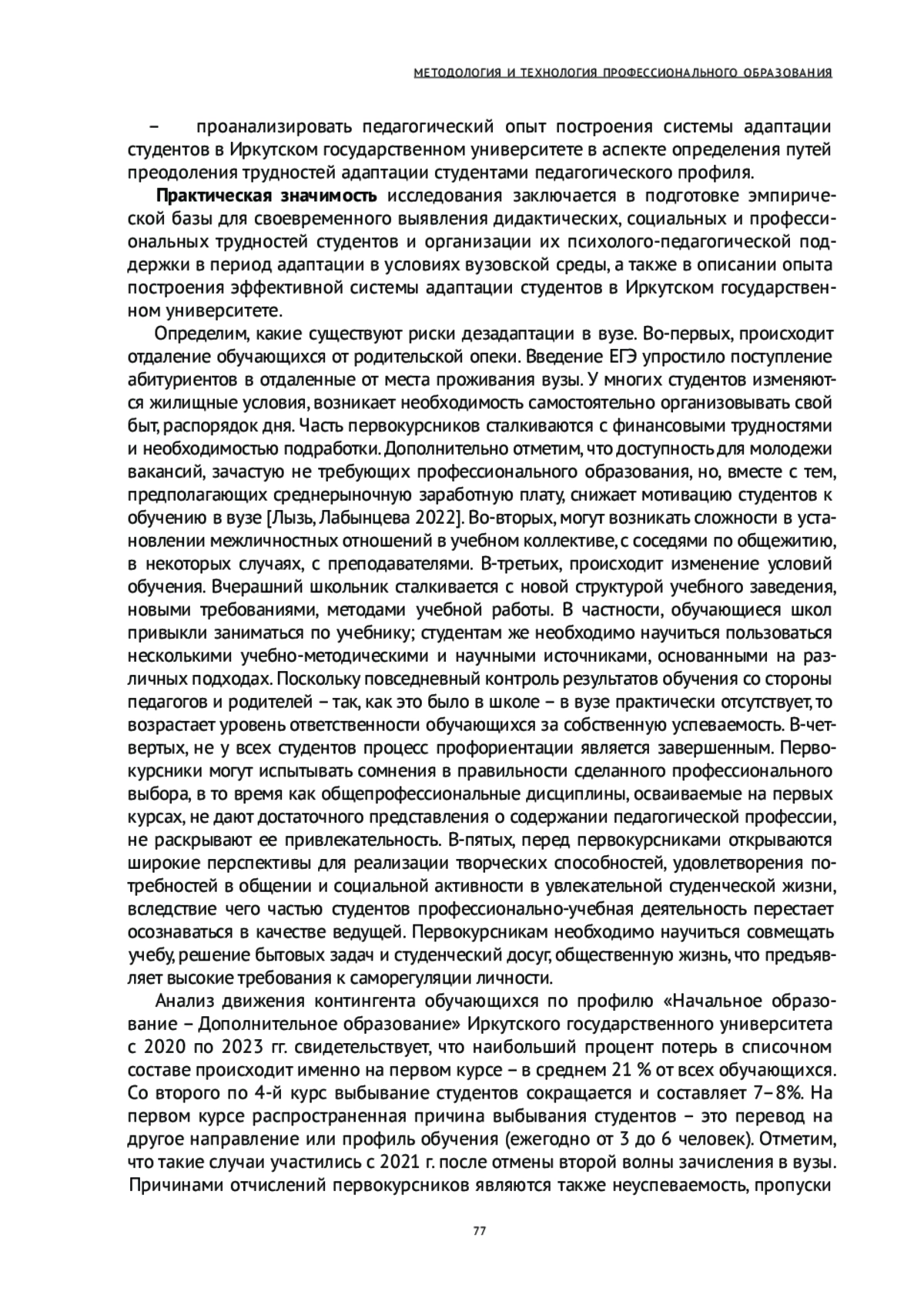 3. Волкова Т. Г., Оспанова Б. К., Жапарова Г. С. Проблема адаптации студентов первого курса в системе обучения вуза // Вестник психологии и педагогики АлтГУ, 2020. № 1. С. 10-16.