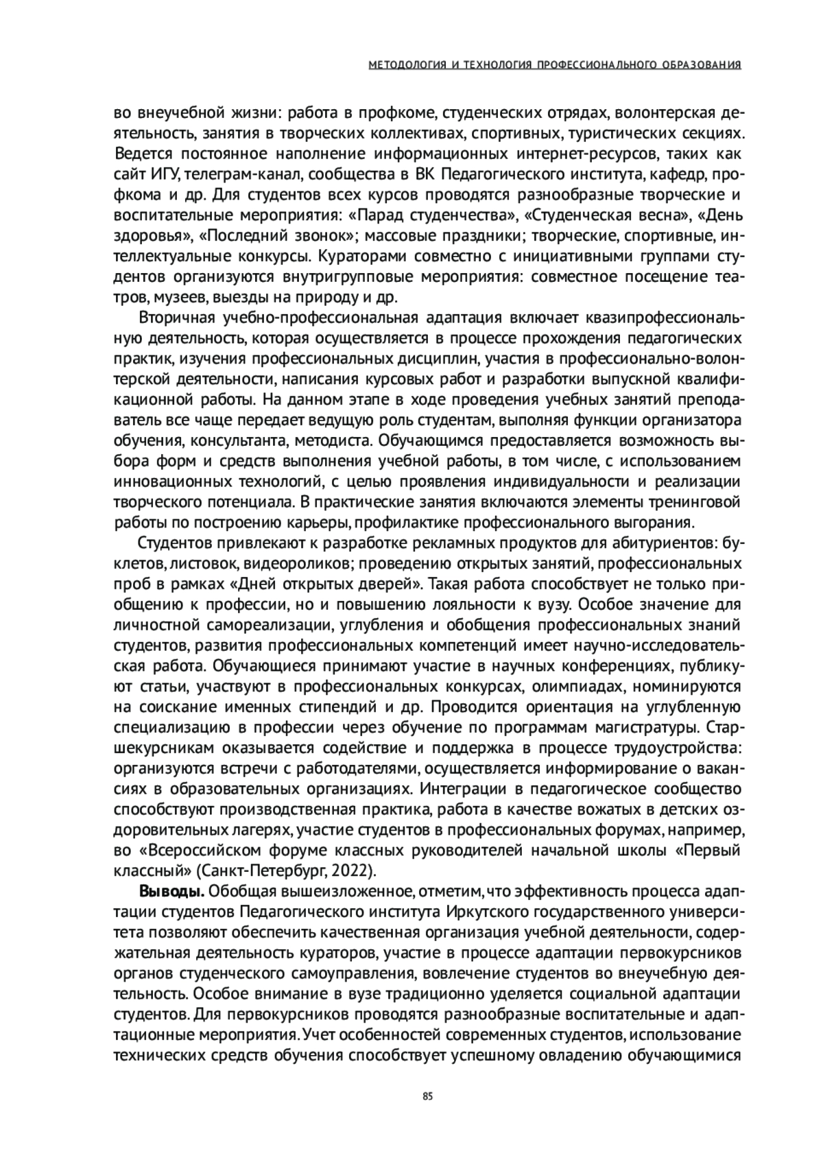 9. Истратова О.Н.Адаптация к вузустудентов с разной выраженностью позиции субъекта профессионального выбора // Азимут научных исследований: педагогика и психология. 2022. Т. 11. № 1(38). С. 45-49. EDN: BQLNMF