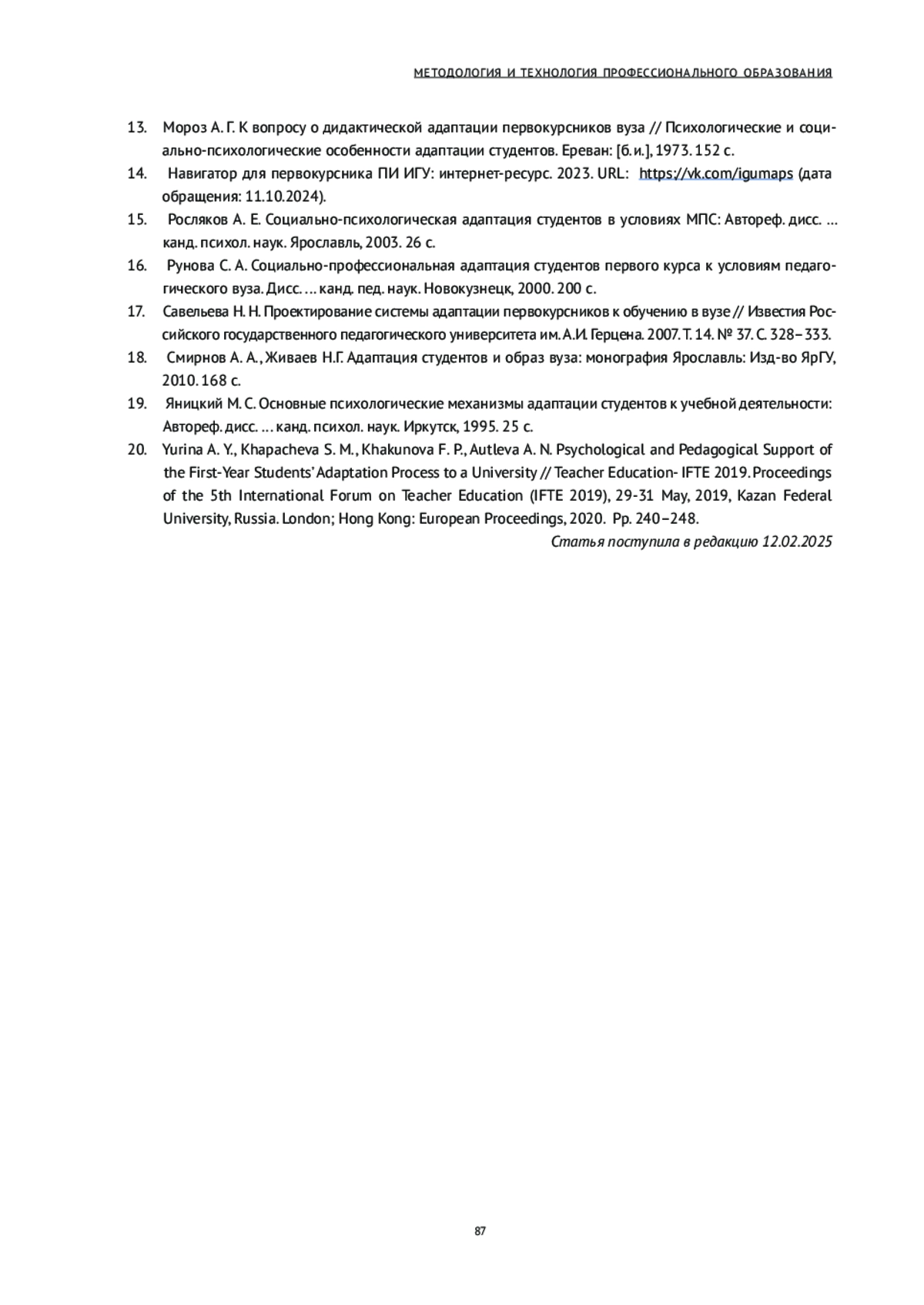 20. Yurina A. Y., Khapacheva S. M., Khakunova F. P., Autleva А. N. Psychological and Pedagogical Support of the First-Year Students’ Adaptation Process to a University // Teacher Education- IFTE 2019. Proceedings of the 5th International Forum on Teacher Education (IFTE 2019), 29-31 May, 2019, Kazan Federal University, Russia. London; Hong Kong: European Proceedings, 2020. Pp. 240-248.