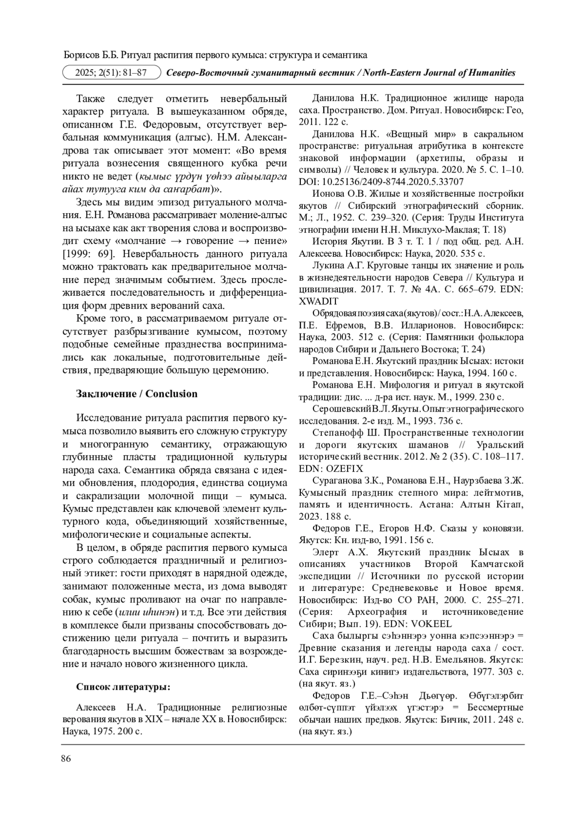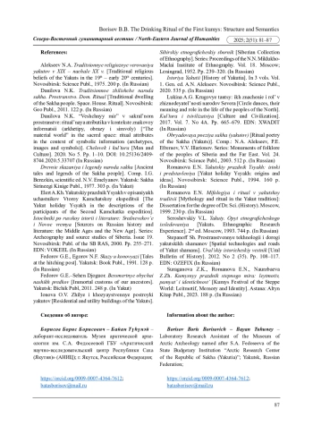 14. Элерт А.Х. Якутский праздник Ысыах в описаниях участников Второй Камчатской экспедиции // Источники по русской истории и литературе: Средневековье и Новое время. Новосибирск: Изд-во СО РАН, 2000. С. 255-271. (Серия: Археография и источниковедение Сибири; Вып. 19). ЭДН: ВОКИЛ. EDN: VOKEEL