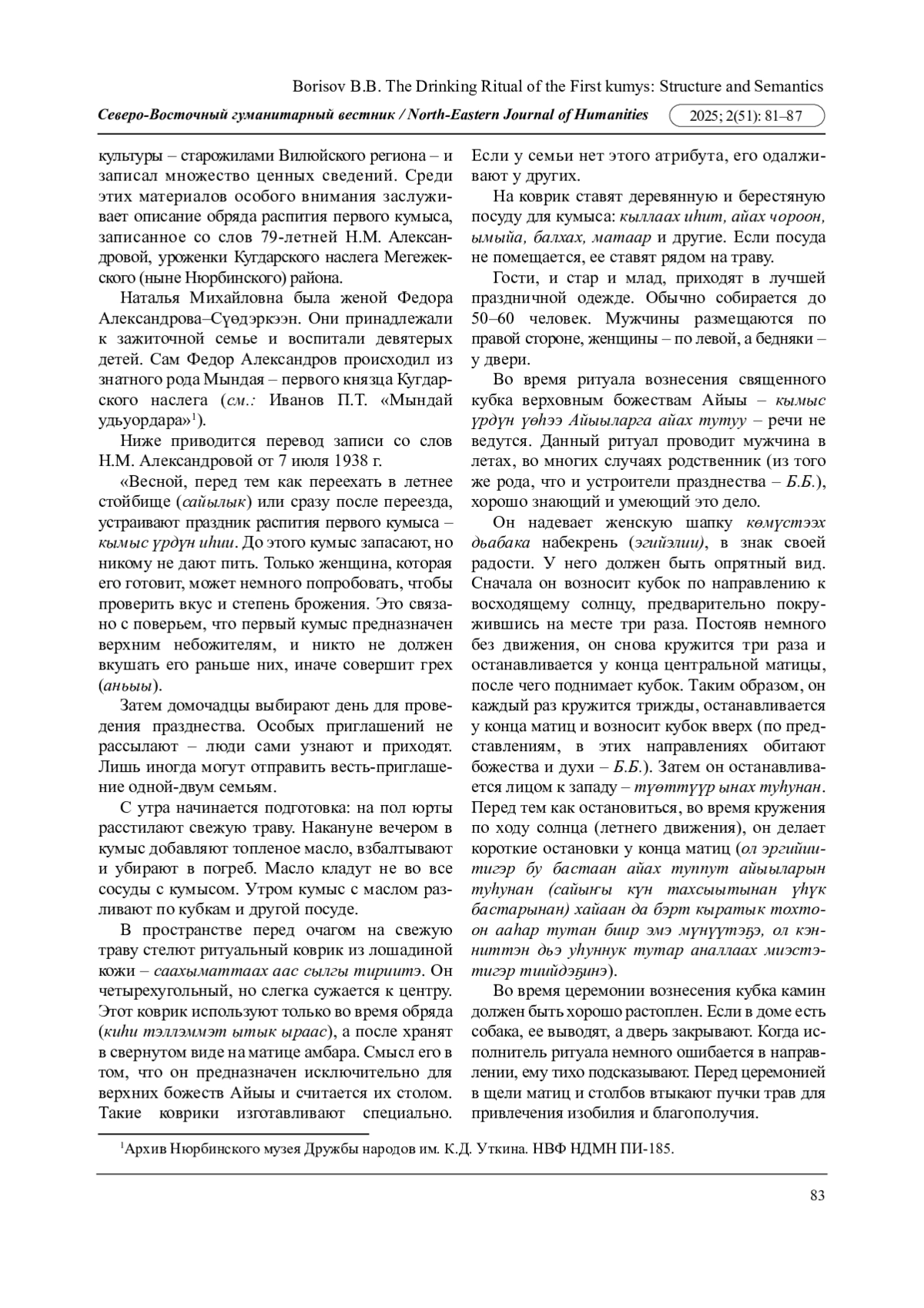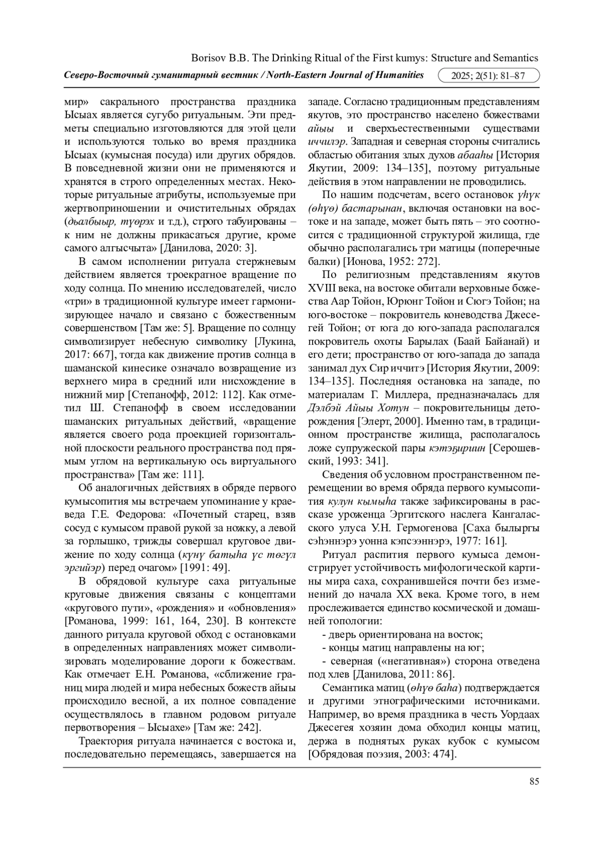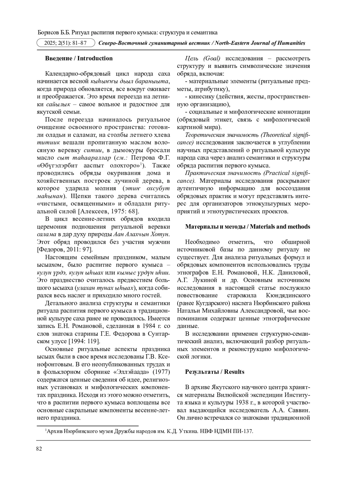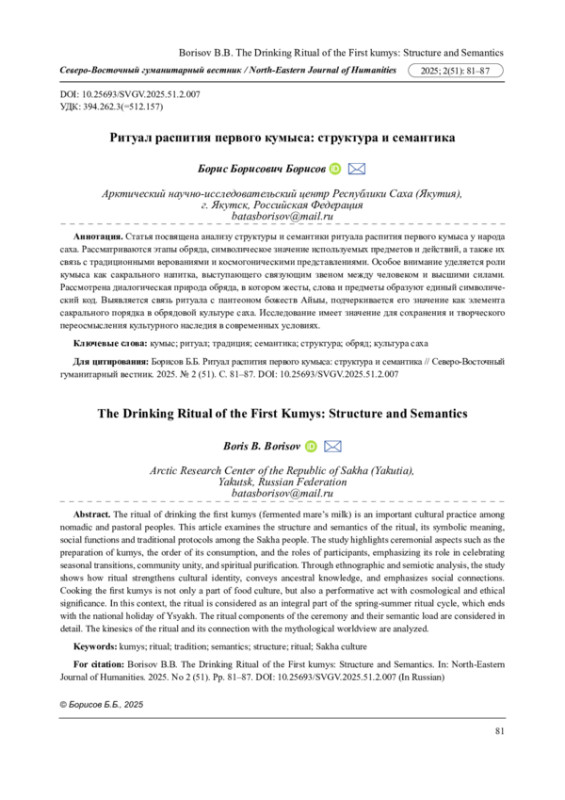 Статья посвящена анализу структуры и семантики ритуала распития первого кумыса у народа саха. Рассматриваются этапы обряда, символическое значение используемых предметов и действий, а также их связь с традиционными верованиями и космогоническими представлениями. Особое внимание уделяется роли кумыса как сакрального напитка, выступающего связующим звеном между человеком и высшими силами. Рассмотрена диалогическая природа обряда, в котором жесты, слова и предметы образуют единый символический код. Выявляется связь ритуала с пантеоном божеств Айыы, подчеркивается его значение как элемента сакрального порядка в обрядовой культуре саха. Исследование имеет значение для сохранения и творческого переосмысления культурного наследия в современных условиях.