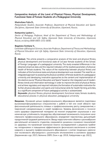 В статье представлен сравнительный анализ уровня и физической подготовленности, физического развития и функционального состояния студенток 1-го курса факультета иностранных языков педагогического вуза. В ходе исследования выявлены различия в полученных эмпирических данных и должных показателях исследуемых параметров физического здоровья студенток. Выявлен характер взаимосвязей физической подготовленности с показателями функционального состояния и физического развития. Обоснована необходимость комплексного подхода к оценке физических кондиций студенток педагогического вуза и разработки инновационных подходов к содержанию и к реализации элективного курса «Физическая культура и спорт» на основе комплексного применения современных направлений фитнеса и информационных технологий в целях повышения уровня физической подготовленности и достижения нормативно- должных показателей, формирования устойчивой мотивации к дальнейшим занятиям физической культурой и спортом и инструктивных навыков здоровьеформирующей деятельности, как значимого компонента будущей педагогической деятельности.