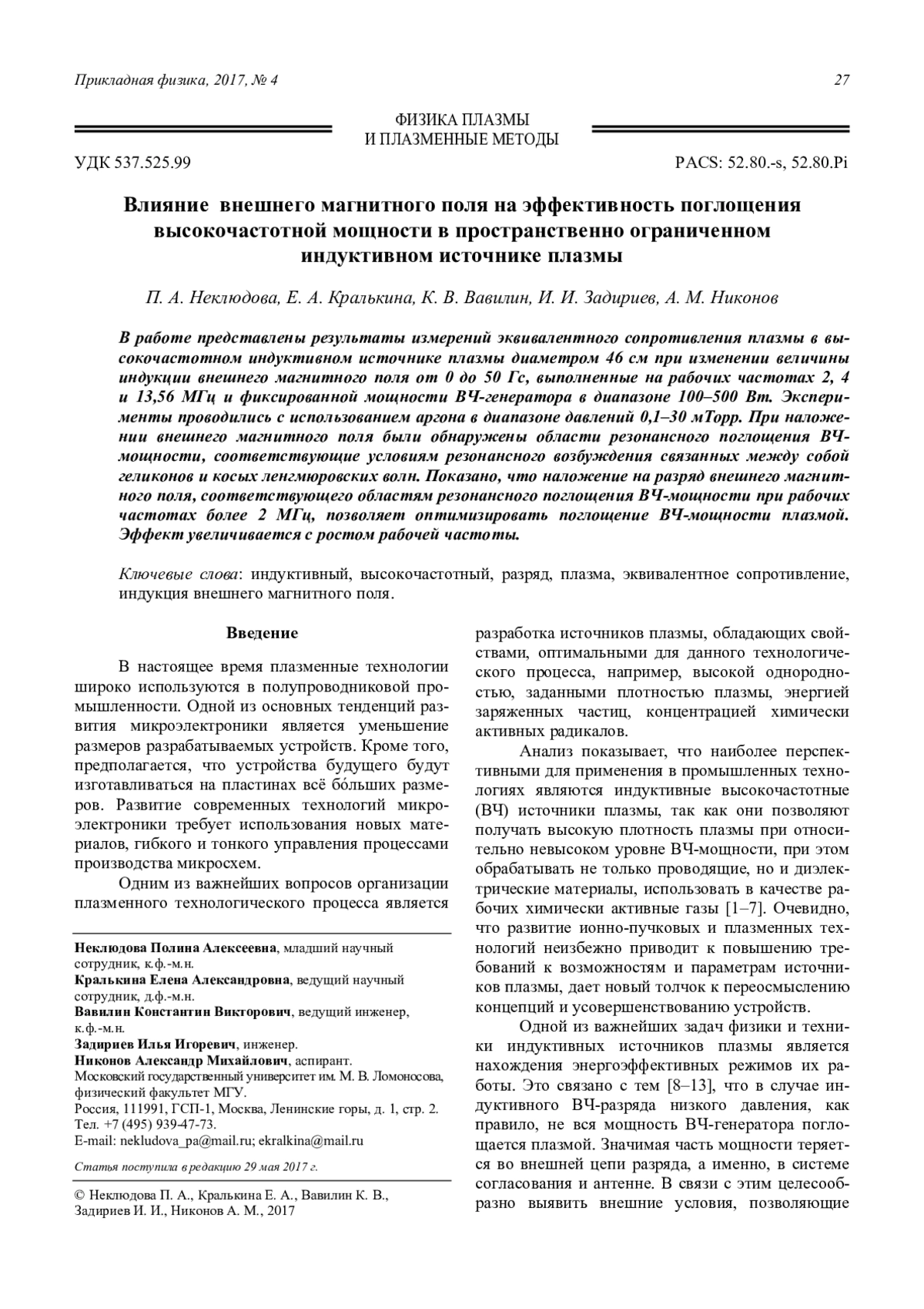 P. A. Nekliudova, E. A. Kralkina, K. V. Vavilin, I. I. Zadiriyev, and A. M. Nikonov Effect of an external magnetic field on the efficien-cy of absorption of high-frequency power in a spatially limited inductive plasma source 27