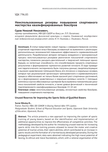 В статье представлен новый подход к совершенствованию системы спортивной подготовки юных боксеров, основанный на выявлении и реализации дополнительных возможностей повышения эффективности соревновательной деятельности. Разработанная автором методика внедрения в тренировочный процесс неиспользованных резервов увеличения показателей спортивного мастерства, позволила раскрыть двигательный и творческий потенциал единоборцев, их латентные способности, что способствовало приросту спортивных результатов и формированию гармонично развитой личности. В ходе проведения педагогического эксперимента были получены данные, свидетельствующие о высоком нравственном потенциале бокса, его этических и моральных основах, которые при рациональной организации тренировочного и соревновательного процесса обеспечивают не только более высокий рост спортивных достижений, но и формирование нравственных и морально-волевых качеств. С помощью комплекса научно обоснованных критериев была выявлена положительная динамика показателей свойств личности, а также уровня физической и технической подготовленности квалифицированных боксеров 13-14 лет.